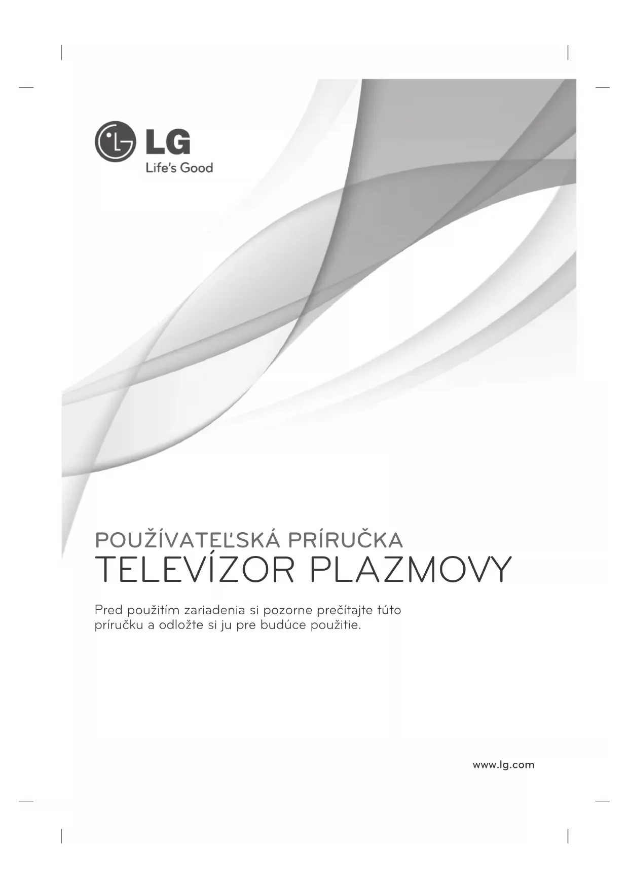 Keďže sa kanál pásma používaného v jednotlivých krajinách môže líšiť, používateľ nemôže zmeniť ale- bo upraviť prevádzkovú frekvenciu a tento produkt je nastavený na regionálnu tabuľku frekvencií. Technické parametre modulu Bluetooth (BM-LDS302) Štandard Bluetooth, verzia 3.0 Frekvenčný rozsah 2400 ~ 2483,5 MHz Výstupný výkon (max.) 10 dBm alebo menej Rýchlosť prenosu údajov (max.) 3 Mbps Komunikačná vzdialenosť Priama viditeľnosť približne 10 mUPORABNIŠKI PRIROČNIK PLAZEMSKI TELEVIZOR Pred uporabo monitorja natančno preberite ta priročnik in ga shranite za prihodnjo uporabo. www.lg.com2