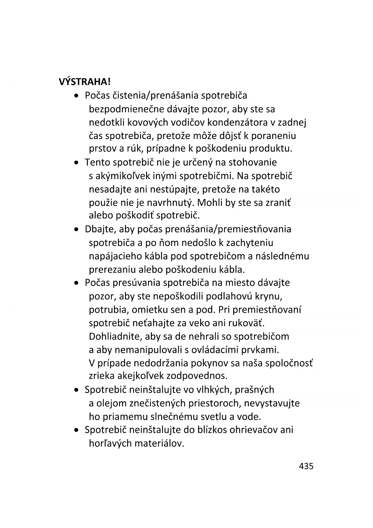 - RIEŠENIE PROBLÉMOV 35 VÝSTRAHA! Počas čistenia/prenášania spotrebiča bezpodmienečne dávajte pozor, aby ste sa nedotkli kovových vodičov kondenzátora v zadnej časti spotrebiča, pretože môže dôjsť k poraneniu prstov a rúk, prípadne k poškodeniu produktu. Tento spotrebič nie je určený na stohovanie s akýmikoľvek inými spotrebičmi. Na spotrebič nesadajte ani nestúpajte, pretože na takéto použitie nie je navrhnutý. Mohli by ste sa zraniť alebo poškodiť spotrebič. Dbajte, aby počas prenášania/premiestňovania spotrebiča a po ňom nedošlo k zachyteniu napájacieho kábla pod spotrebičom a následnému prerezaniu alebo poškodeniu kábla. Počas presúvania spotrebiča na miesto dávajte pozor, aby ste nepoškodili podlahovú krytinu, potrubia, omietku stien a pod. Pri premiestňovaní spotrebič neťahajte za veko ani rukoväť. Dohliadnite, aby sa deti nehrali so spotrebičom a aby nemanipulovali s ovládacími prvkami. V prípade nedodržania pokynov sa naša spoločnosť zrieka akejkoľvek zodpovednosti. Spotrebič neinštalujte vo vlhkých, prašných a olejom znečistených priestoroch, nevystavujte ho priamemu slnečnému svetlu a vode. Spotrebič neinštalujte do blízkosti ohrievačov ani horľavých materiálov.436 V prípade výpadku prúdu neotvárajte veko. Výpadok kratší než 20 hodín nebude mať žiadny vplyv na zmrazené potraviny. V prípade dlhšieho výpadku treba potraviny skontrolovať a okamžite skonzumovať, prípadne tepelne upraviť a následne znova zmraziť. Ak sa vám zdá, že veko truhlicovej mrazničky sa bezprostredne po zatvorení otvára veľmi sťažka, nie je to dôvod na obavu. Je to spôsobené rozdielom tlaku, ktorý sa po niekoľkých minútach vyrovná, takže sa veko bude dať znova normálne otvoriť. Pred zapojením spotrebiča do elektrickej siete odstráňte všetok obalový materiál a prepravné ochranné prvky. Ak sa zariadenie prepravovalo vo vodorovnej polohe, pred zapnutím ho nechajte aspoň 4 hodiny stáť vo vzpriamenej polohe, aby sa usadil olej v kompresore. Táto mraznička sa smie používať iba na určený účel (t. j. uskladňovanie a zmrazovanie potravín určených na konzumáciu). V chladiacich boxoch na víno neskladujte lieky ani laboratórne materiály. Ak potrebujete uskladniť materiál, ktorý vyžaduje presnú reguláciu teploty skladovania, je možné, že sa znehodnotí, prípadne môže dôjsť k nekontrolovanej reakcii, ktorá môže spôsobiť riziká.437 Pred začatím vykonávania akejkoľvek činnosti vytiahnite napájací kábel z elektrickej zásuvky. Po doručení zásielky skontrolujte, či produkt nie je poškodený a či sú všetky diely a príslušenstvo v bezchybnom stave. Ak spozorujete netesnosť chladiaceho systému, nedotýkajte sa elektrickej zásuvky a nepoužívajte otvorené plamene. Otvorte okno a vyvetrajte miestnosť. Následne zatelefonujte do servisného strediska a požiadajte o vykonanie opravy. Nepoužívajte predlžovacie káble ani adaptéry. Napájací kábel neťahajte príliš veľkou silou ani ho neskrúcajte, zástrčky sa nedotýkajte mokrými rukami. Nepoškoďte zástrčku ani napájací kábel. Mohlo by dôjsť k zásahu elektrickým prúdom alebo požiaru. Ak je poškodený elektrický napájací kábel, musíte ho dať vymeniť výrobcovi, v autorizovanom servisnom stredisku alebo to musí urobiť iná kvalifikovaná osoba, aby sa predišlo akémukoľvek riziku. Nepoužívajte na uchovávanie či skladovanie horľavých a veľmi prchavých materiálov, ako sú napríklad éter, benzín, skvapalnený plyn (LPG), plynný propán, spreje v plechovkách pod tlakom, priľnavé látky, čistý alkohol atď. Tieto materiály môžu spôsobiť výbuch. V blízkosti chladiacich boxov na víno nepoužívajte438 ani neskladujte horľavé spreje, napríklad striekacie laky. Mohlo by dôjsť k výbuchu alebo požiaru. Na spotrebič neklaďte predmety ani nádoby naplnené vodou. Neodporúčame používanie predlžovacích káblov a viaccestných adaptérov. Spotrebič nelikvidujte v ohni. Dávajte pozor, aby počas prepravy a používania nedošlo k poškodeniu chladiaceho okruhu a chladiacich rúrok spotrebiča. V prípade poškodenia ochráňte spotrebič pred ohňom a potenciálnymi zdrojmi vzplanutia a okamžite vyvetrajte miestnosť, v ktorej sa spotrebič nachádza. Chladiaci systém, ktorý sa nachádza za chladiacimi boxmi na víno a v ich vnútrajšku, obsahuje chladivo. Preto dbajte, aby nedošlo k poškodeniu potrubí. Vnútri boxov spotrebiča, ktoré slúžia na skladovanie potravín, nepoužívajte elektrické spotrebiče, pokiaľ ich používanie neschválil výrobca. Nepoškoďte chladiaci okruh. Na urýchlenie odmrazovania nepoužívajte mechanické zariadenia ani iné prostriedky s výnimkou tých, ktoré odporúča výrobca. Vnútri boxov, ktoré slúžia na skladovanie potravín, nepoužívajte elektrické spotrebiče, pokiaľ ich používanie neschválil výrobca.439 Nedotýkajte interných chladiacich prvkov, predovšetkým ak máte mokré ruky, pretože by ste sa mohli popáliť alebo zraniť. Dávajte pozor, aby nedošlo k blokovaniu vetracích otvorov v kryte spotrebiča alebo v zabudovanej konštrukcii. Na odstraňovanie námrazy nepoužívajte špicaté predmety ani predmety s ostrými hranami, ako napríklad nože alebo vidličky. Na odmrazovanie nikdy nepoužívajte sušiče vlasov, elektrické ohrievače alebo podobné elektrické spotrebiče. Námrazu alebo ľad neoškrabávajte nožom ani ostrým predmetom. Takéto predmety môžu poškodiť chladiaci okruh a spôsobiť únik chladiva, čo môže viesť k požiaru alebo poraneniu očí. Na urýchlenie procesu odmrazovania nepoužívajte mechanické zariadenia ani iné vybavenie. Na urýchlenie odmrazovania v žiadnom prípade nepoužívajte otvorený plameň ani elektrické vybavenie, ako napríklad ohrievače, parné čističe, sviečky, olejové lampy a po