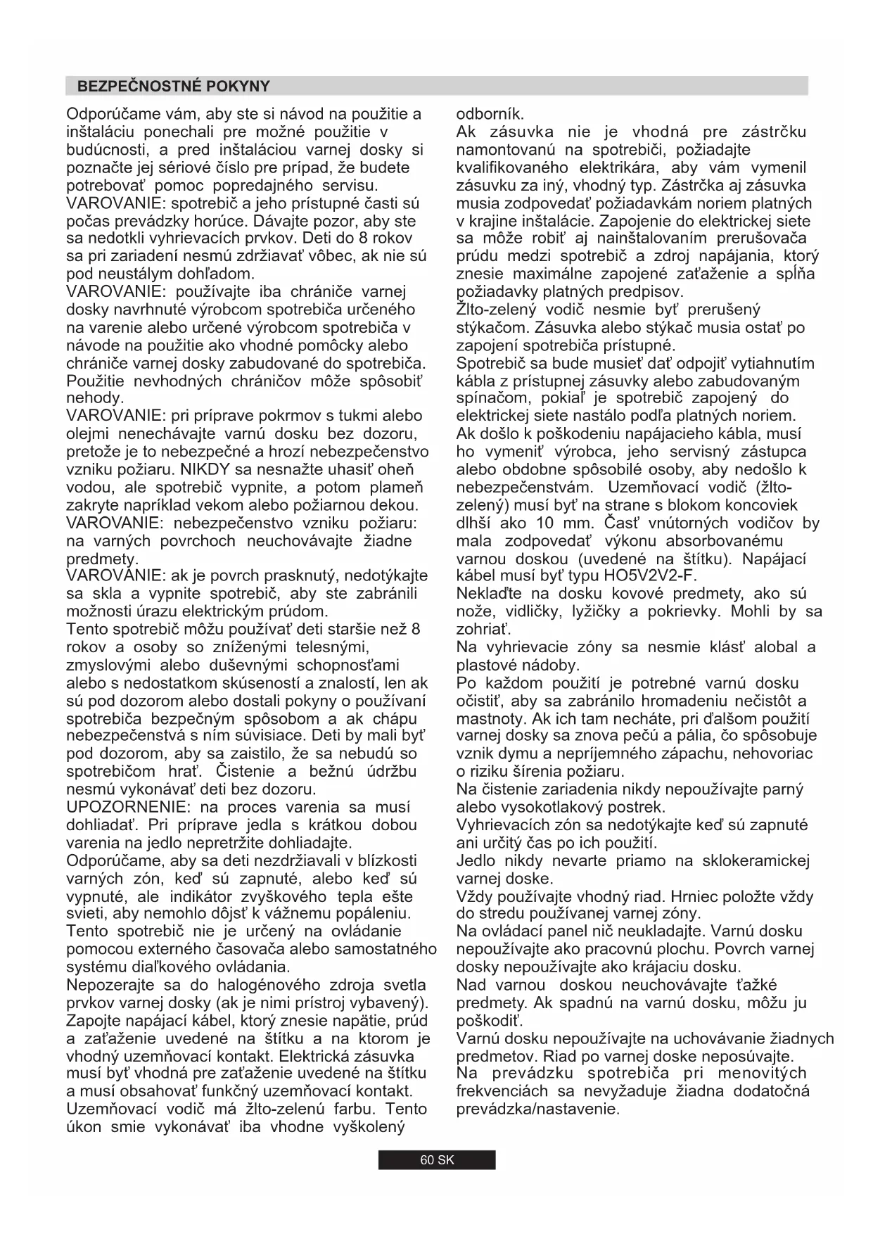 VAROVANIE: používajte iba chrániče varnej dosky navrhnuté výrobcom spotrebiča určeného na varenie alebo určené výrobcom spotrebiča v návode na použitie ako vhodné pomôcky alebo chrániče varnej dosky zabudované do spotrebiča. Použitie nevhodných chráničov môže spôsobiť nehody. Odporúčame vám, aby ste si návod na použitie a inštaláciu ponechali pre možné použitie v budúcnosti, a pred inštaláciou varnej dosky si poznačte jej sériové číslo pre prípad, že budete potrebovať pomoc popredajného servisu. VAROVANIE: spotrebič a jeho prístupné časti sú počas prevádzky horúce. Dávajte pozor, aby ste sa nedotkli vyhrievacích prvkov. Deti do 8 rokov sa pri zariadení nesmú zdržiavať vôbec, ak nie sú pod neustálym dohľadom. Zapojte napájací kábel, ktorý znesie napätie, prúd a zaťaženie uvedené na štítku a na ktorom je vhodný uzemňovací kontakt. Elektrická zásuvka musí byť vhodná pre zaťaženie uvedené na štítku a musí obsahovať funkčný uzemňovací kontakt. Uzemňovací vodič má žlto-zelenú farbu. Tento úkon smie vykonávať iba vhodne vyškolený Nepozerajte sa do halogénového zdroja svetla prvkov varnej dosky (ak je nimi prístroj vybavený). Tento spotrebič nie je určený na ovládanie pomocou externého časovača alebo samostatného systému diaľkového ovládania. VAROVANIE: ak je povrch prasknutý, nedotýkajte sa skla a vypnite spotrebič, aby ste zabránili možnosti úrazu elektrickým prúdom. UPOZORNENIE: na proces varenia sa musí dohliadať. Pri príprave jedla s krátkou dobou varenia na jedlo nepretržite dohliadajte. VAROVANIE: pri príprave pokrmov s tukmi alebo olejmi nenechávajte varnú dosku bez dozoru, pretože je to nebezpečné a hrozí nebezpečenstvo vzniku požiaru. NIKDY sa nesnažte uhasiť oheň vodou, ale spotrebič vypnite, a potom plameň zakryte napríklad vekom alebo požiarnou dekou. Odporúčame, aby sa deti nezdržiavali v blízkosti varných zón, keď sú zapnuté, alebo keď sú vypnuté, ale indikátor zvyškového tepla ešte svieti, aby nemohlo dôjsť k vážnemu popáleniu. Tento spotrebič môžu používať deti staršie než 8 rokov a osoby so zníženými telesnými, zmyslovými alebo duševnými schopnosťami alebo s nedostatkom skúseností a znalostí, len ak sú pod dozorom alebo dostali pokyny o používaní spotrebiča bezpečným spôsobom a ak chápu nebezpečenstvá s ním súvisiace. Deti by mali byť pod dozorom, aby sa zaistilo, že sa nebudú so spotrebičom hrať. Čistenie a bežnú údržbu nesmú vykonávať deti bez dozoru. VAROVANIE: nebezpečenstvo vzniku požiaru: na varných povrchoch neuchovávajte žiadne predmety. Vždy používajte vhodný riad. Hrniec položte vždy do stredu používanej varnej zóny. Žlto-zelený vodič nesmie byť prerušený stýkačom. Zásuvka alebo stýkač musia ostať po zapojení spotrebiča prístupné. Spotrebič sa bude musieť dať odpojiť vytiahnutím kábla z prístupnej zásuvky alebo zabudovaným spínačom, pokiaľ je spotrebič zapojený do elektrickej siete nastálo podľa platných noriem. odborník. Na čistenie zariadenia nikdy nepoužívajte parný alebo vysokotlakový postrek. Neklaďte na dosku kovové predmety, ako sú nože, vidličky, lyžičky a pokrievky. Mohli by sa zohriať. Ak zásuvka nie je vhodná pre zástrčku namontovanú na spotrebiči, požiadajte kvalifikovaného elektrikára, aby vám vymenil zásuvku za iný, vhodný typ. Zástrčka aj zásuvka musia zodpovedať požiadavkám noriem platných v krajine inštalácie. Zapojenie do elektrickej siete sa môže robiť aj nainštalovaním prerušovača prúdu medzi spotrebič a zdroj napájania, ktorý znesie maximálne zapojené zaťaženie a spĺňa požiadavky platných predpisov. Po každom použití je potrebné varnú dosku očistiť, aby sa zabránilo hromadeniu nečistôt a mastnoty. Ak ich tam necháte, pri ďalšom použití varnej dosky sa znova pečú a pália, čo spôsobuje vznik dymu a nepríjemného zápachu, nehovoriac o riziku šírenia požiaru. Vyhrievacích zón sa nedotýkajte keď sú zapnuté ani určitý čas po ich použití. Nad varnou doskou neuchovávajte ťažké predmety. Ak spadnú na varnú dosku, môžu ju poškodiť. Na prevádzku spotrebiča pri menovitých frekvenciách sa nevyžaduje žiadna dodatočná prevádzka/nastavenie. Jedlo nikdy nevarte priamo na sklokeramickej varnej doske. Varnú dosku nepoužívajte na uchovávanie žiadnych predmetov. Riad po varnej doske neposúvajte. Na vyhrievacie zóny sa nesmie klásť alobal a plastové nádoby. Na ovládací panel nič neukladajte. Varnú dosku nepoužívajte ako pracovnú plochu. Povrch varnej dosky nepoužívajte ako krájaciu dosku. Ak došlo k poškodeniu napájacieho kábla, musí ho vymeniť výrobca, jeho servisný zástupca alebo obdobne spôsobilé osoby, aby nedošlo k nebezpečenstvám. Uzemňovací vodič (žlto- zelený) musí byť na strane s blokom koncoviek dlhší ako 10 mm. Časť vnútorných vodičov by mala zodpovedať výkonu absorbovanému varnou doskou (uvedené na štítku). Napájací kábel musí byť typu HO5V2V2-F.Kovové objekty nachádzajúce sa v zásuvke môžu v dôsledku opätovnej cirkulácie vzduchu dosahovať vysoké teploty. Preto sa odporúča použiť drevenú vložku. Ak je varná doska 60 cm upevnená nad rúrou, ktorá nie je vybavená chladiacim systémom s ventilátorom, odporúča sa pripraviť na kuchynskej skrinke, v ktorej je zabudovaná varná doska, otvory na zaistenie správnej cirkulácie vzduchu. Ak je varná doska namontovaná tak, že sa na ktorejkoľvek jej strane nachádza skrinka, musí byť vzdialenosť medzi varnou doskou a skrinkou minimálne 15 cm, zatiaľ čo vzdialenosť medzi výrezom a zadnou stenou musí byť najmenej 7 cm. Vzdialenosť medzi varnou doskou a inou jednotkou alebo spotrebičom, ktorý je umiestnený nad varnou doskou (napr. odsávač pár), m