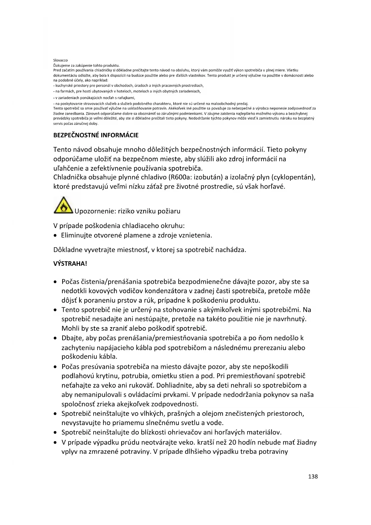 Tento návod obsahuje mnoho dôležitých bezpečnostných informácií. Tieto pokyny odporúčame uložiť na bezpečnom mieste, aby slúžili ako zdroj informácií na uľahčenie a zefektívnenie používania spotrebiča. Chladnička obsahuje plynné chladivo (R600a: izobután) a izolačný plyn (cyklopentán), ktoré predstavujú veľmi nízku záťaž pre životné prostredie, sú však horľavé. Upozornenie: riziko vzniku požiaru V prípade poškodenia chladiaceho okruhu: