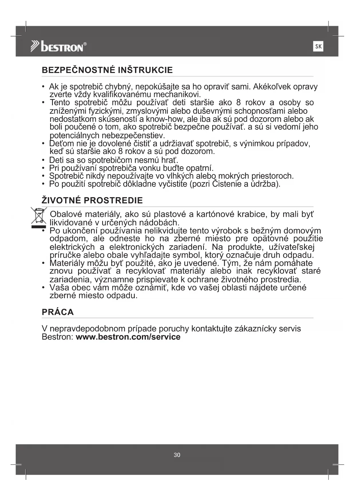 V nepravdepodobnom prípade poruchy kontaktujte zákaznícky servis Bestron: www.bestron.com/service