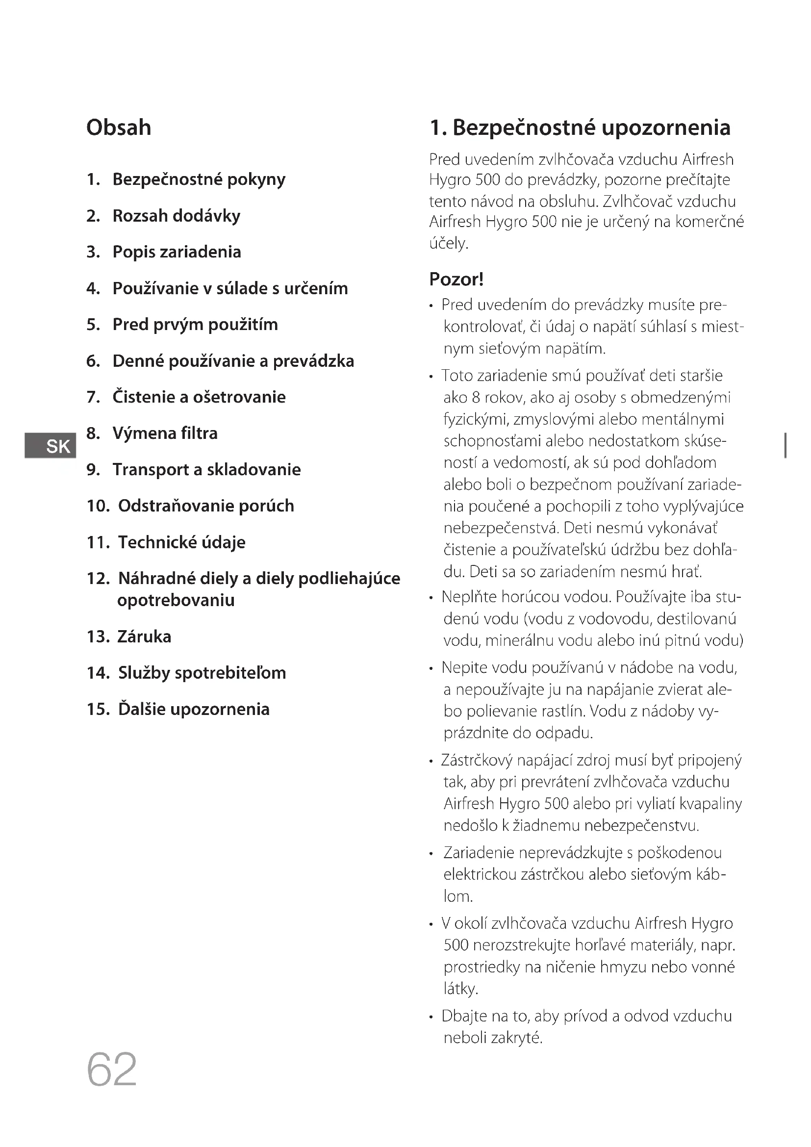 Pred uvedením zvlhčovača vzduchu Airfresh Hygro 500 do prevádzky, pozorne prečítajte tento návod na obsluhu. Zvlhčovač vzduchu Airfresh Hygro 500 nie je určený na komerčné účely. Pozor!