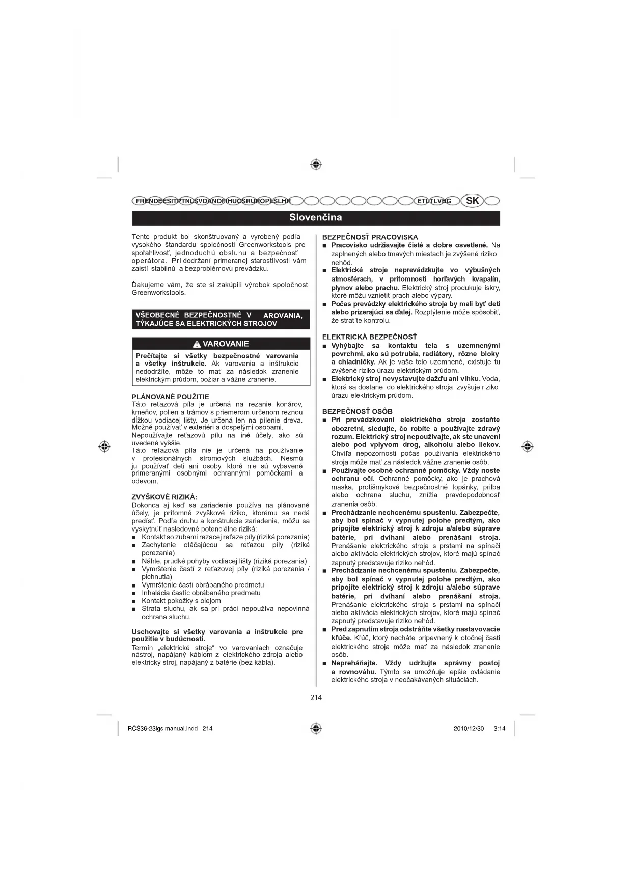 Zaručený akustický výkon je 97dB. Nasledujúce značky a významy vysvetľujú úroveň rizika spojeným s výrobkom. Značka Znamenie Význam NEBEZPEČENSTVO Označuje bezprostredne nebezpečnú situáciu, ktorá môže vyústiť v smrť, alebo vážne zranenie. VAROVANIE Označuje potenciálne nebezpečnú situáciu, ktorá môže vyústiť v smrť, alebo vážne zranenie. VÝSTRAHA Označuje potenciálne nebezpečnú situáciu, ktorá môže vyústiť v ľahké, alebo stredne ťažké zranenie. VÝSTRAHA (bez výstražnej značky s výkričníkom) Označuje situáciu, ktorá môže zapríčiniť škody na majetku. RCS36-23lgs manual.indd 217 2010/12/30 3:14218 Slovenčina FR EN DE ES IT PT NL SV DA NO FI HU CS RU RO PL SL HR