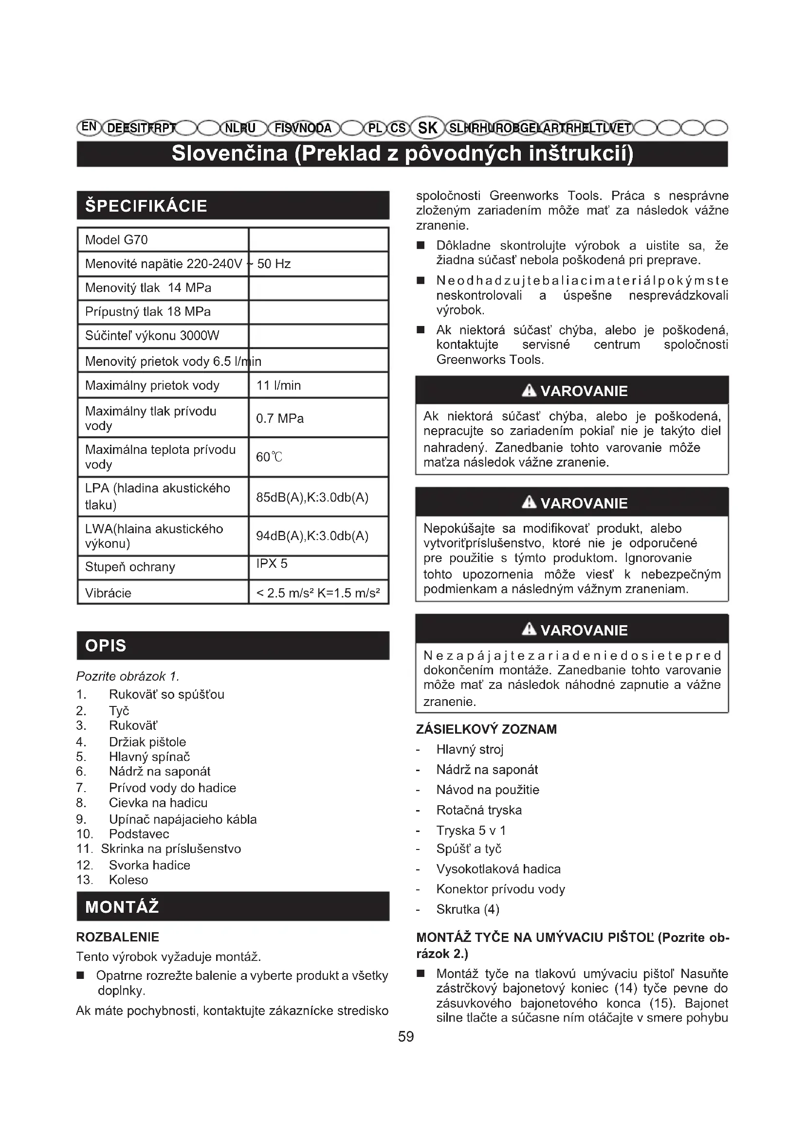 DE ES IT FR PTNL RUFI SV NO DA SL HR HU RO BG EL AR TR HE LT LV ET ŠPECIFIKÁCIE Model G70 Menovité napätie 220-240V ~ 50 Hz Menovitý tlak 14 MPa Prípustný tlak 18 MPa Súčinteľ výkonu 3000W Menovitý prietok vody 6.5 l/min Maximálny prietok vody 11 l/min Maximálny tlak prívodu vody