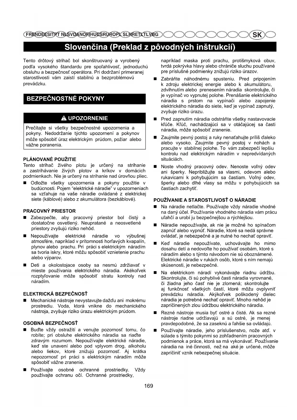 Tento strihač živého plotu je určený na strihanie a zastrihávanie živých plotov a kríkov v domácich podmienkach. Nie je určený na strihanie nad úrovňou pliec. Odložte všetky upozornenia a pokyny použitie v budúcnosti. Pojem “elektrické náradie” v upozorneniach sa vzťahuje na vaše náradie ovládané z elektrickej siete (káblové) alebo z akumulátora (bezkáblové). PRACOVNÝ PRIESTOR Zabezpečte, aby pracovný priestor bol čistý a dostatočne osvetlený. Neupratané a neosvetlené priestory zvyšujú riziko nehôd. Nepoužívajte elektrické náradie vo výbušnej atmosfére, napríklad v prítomnosti horľavých kvapalín, plynov alebo prachu. Pri práci s elektrickým náradím sa tvoria iskry, ktoré môžu spôsobiť vznietenie prachu alebo výparov. Deti a okolostojace osoby sa nesmú zdržiavať v mieste používania elektrického náradia. Akékoľvek rozptyľovanie môže spôsobiť stratu kontroly nad náradím.
