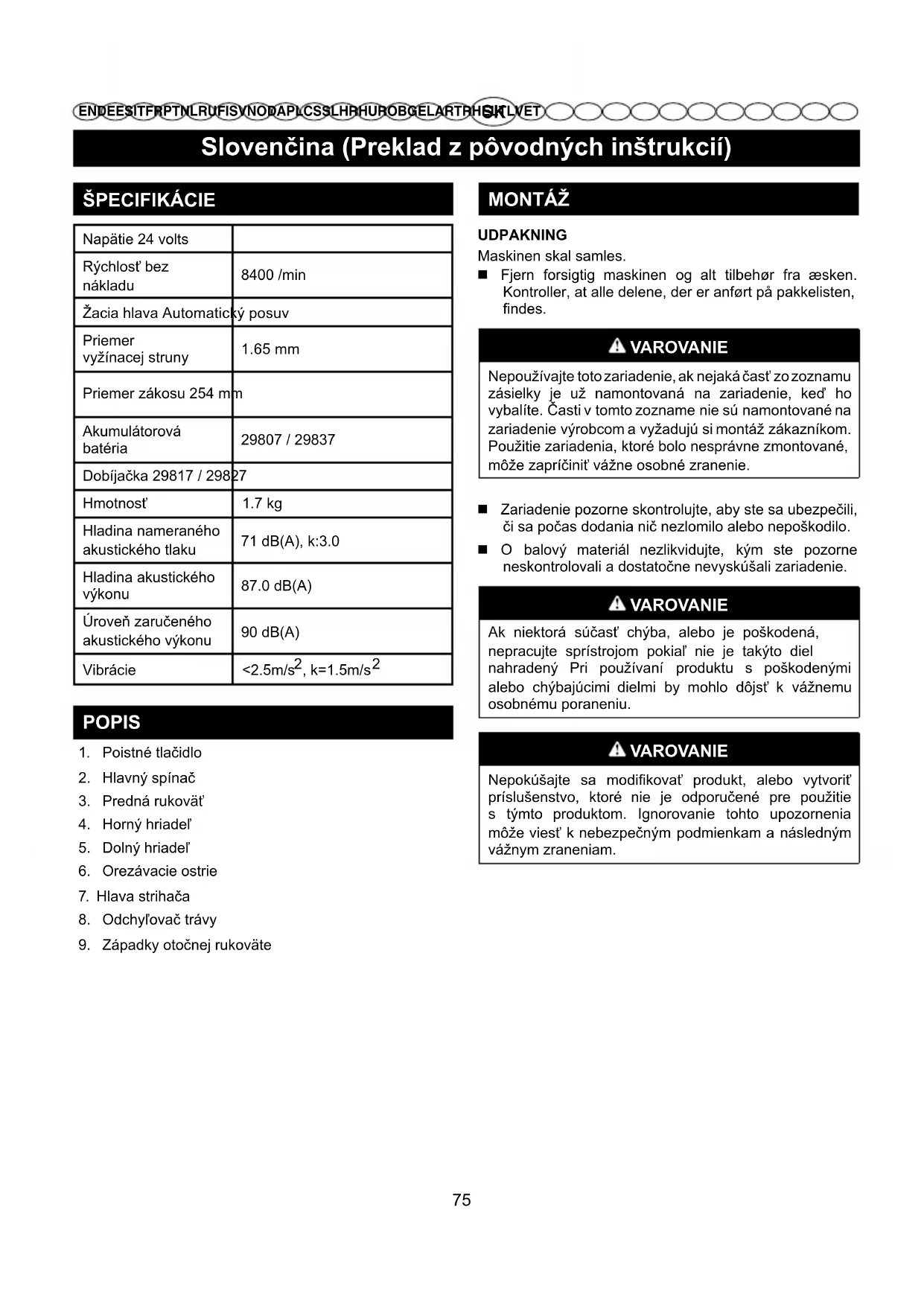 EN DE ES IT FR PT NL RU FI SV NO DA PL CS SL HR HU RO BG EL AR TR HE LT LV ET VAROVANIE V prípade výmeny používajte výlučne originálne náhradné diely. Použitie iných súčiastok by mohlo predstavovať nebezpečenstvo alebo poškodiť stroj. VAROVANIE Pred vykonaním akéhokoľvek čistiaceho úkonu alebo údržby stroja vyberte vždy akumulátorovú batériu z prístroja, inak hrozí riziko nehody.