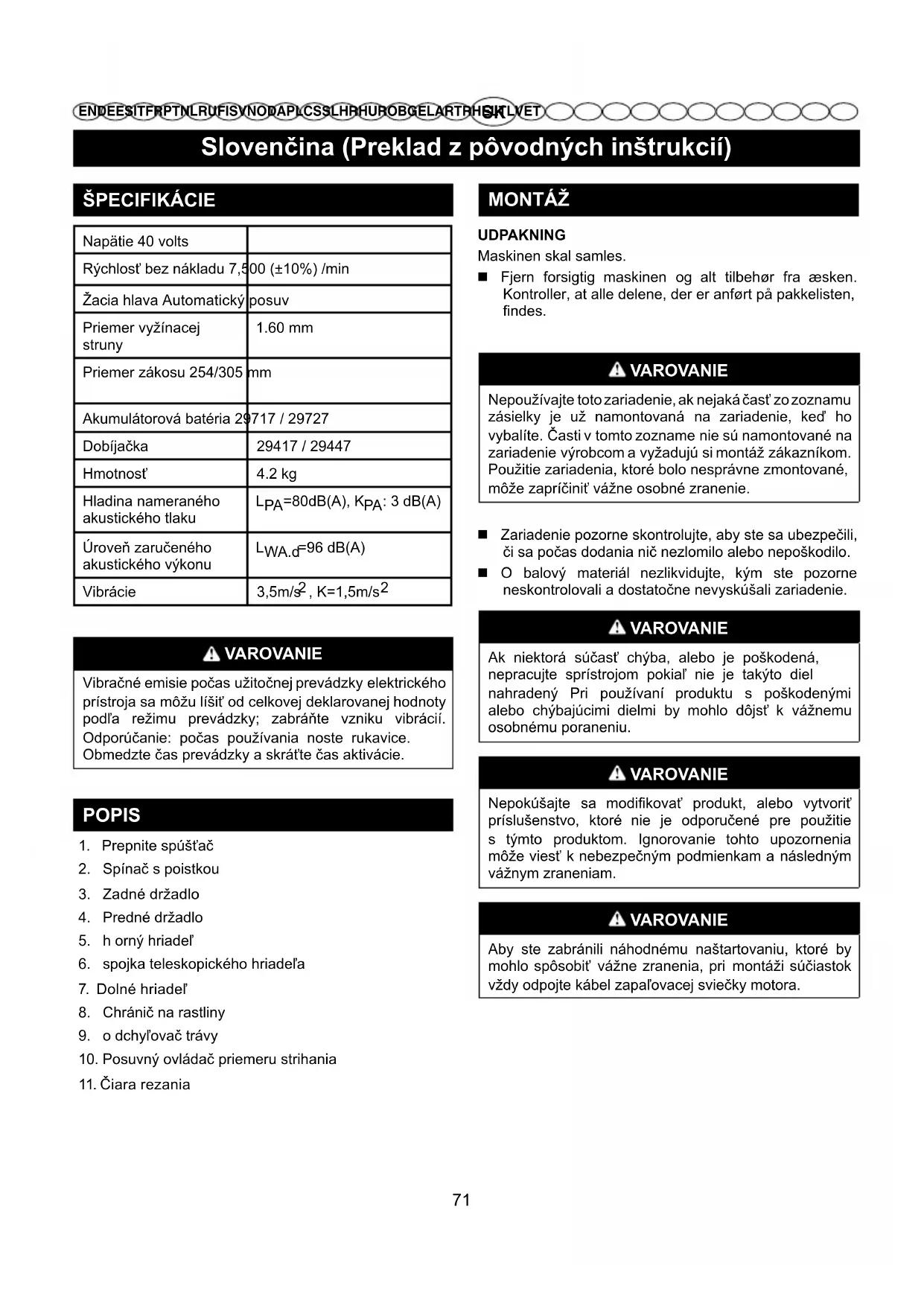 VAROVANIE Vibračné emisie počas užitočnej prevádzky elektrického prístroja sa môžu líšiť od celkovej deklarovanej hodnoty podľa režimu prevádzky; zabráňte vzniku vibrácií. Odporúčanie: počas používania noste rukavice. Obmedzte čas prevádzky a skráťte čas aktivácie. POPIS