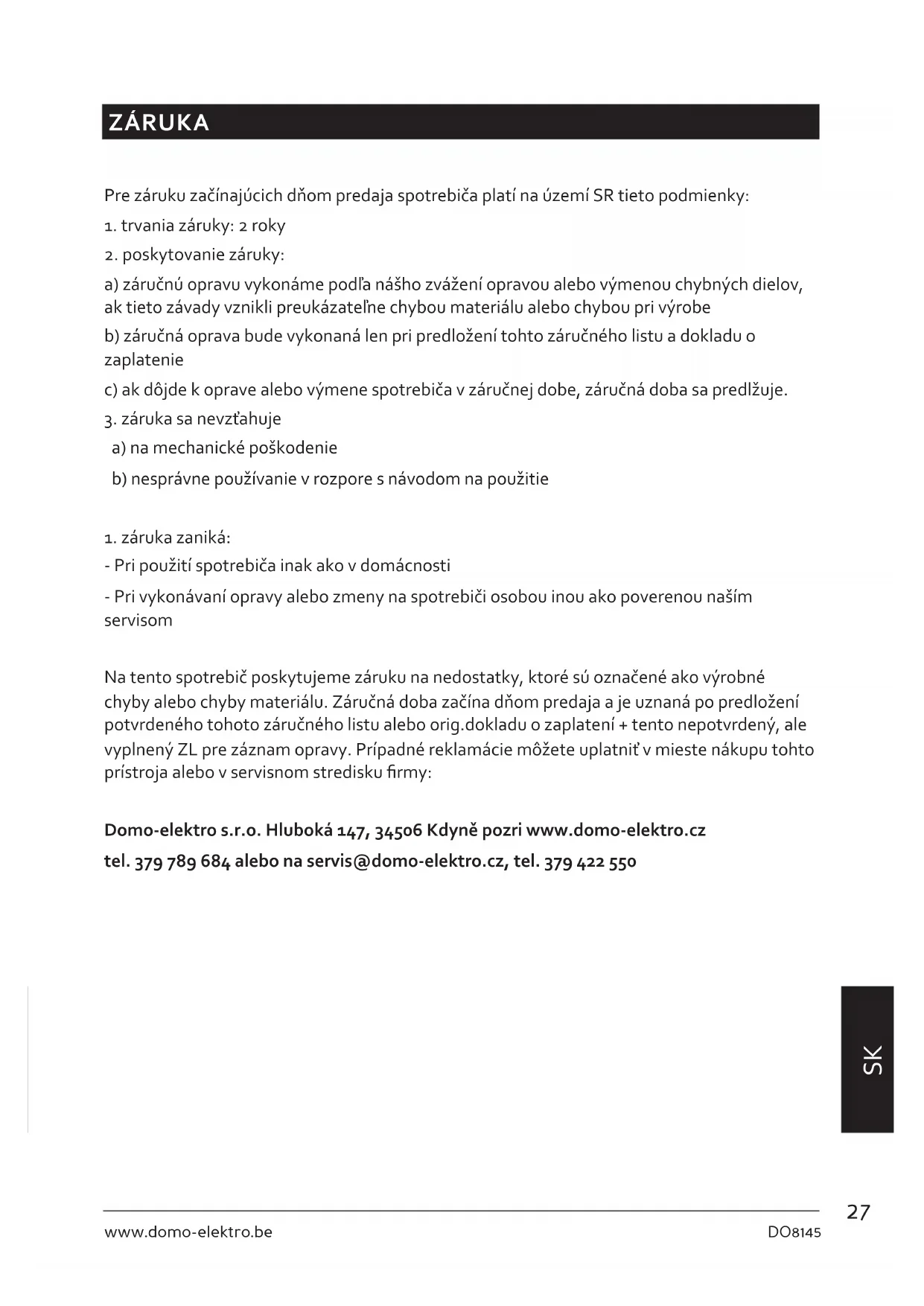 - Pri použití spotrebiča inak ako v domácnosti - Pri vykonávaní opravy alebo zmeny na spotrebiči osobou inou ako poverenou naším servisom Na tento spotrebič poskytujeme záruku na nedostatky, ktoré sú označené ako výrobné chyby alebo chyby materiálu. Záručná doba začína dňom predaja a je uznaná po predložení potvrdeného tohoto záručného listu alebo orig.dokladu o zaplatení + tento nepotvrdený, ale vyplnený ZL pre záznam opravy. Prípadné reklamácie môžete uplatniť v mieste nákupu tohto prístroja alebo v servisnom stredisku rmy: Domo-elektro s.r.o. Hluboká 147, 34506 Kdyně pozri www.domo-elektro.cz tel. 379 789 684 alebo na servis@domo-elektro.cz, tel. 379 422 55028 DO8145