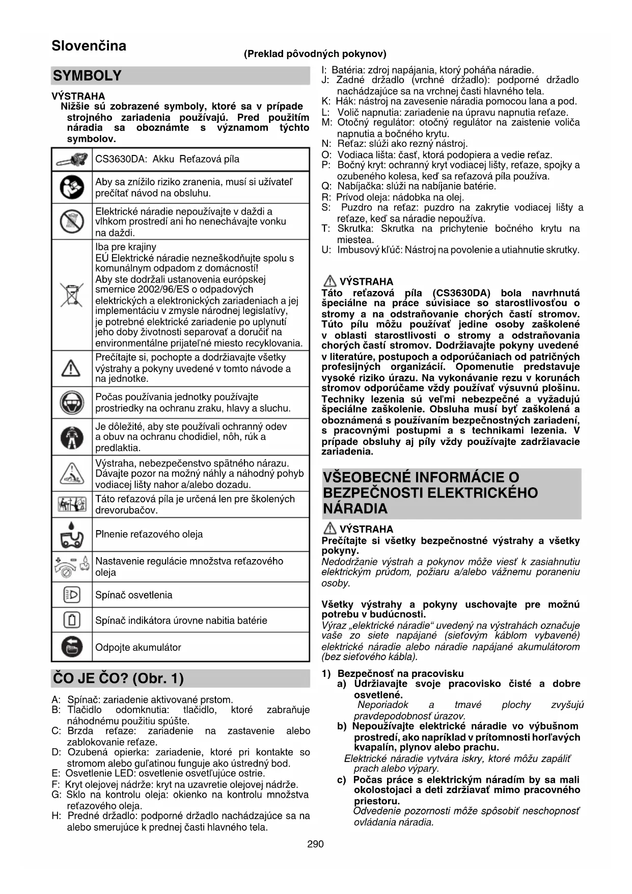 a) Udržiavajte svoje pracovisko čisté a dobre osvetlené. Neporiadok a tmavé plochy zvyšujú pravdepodobnosť úrazov. b) Nepoužívajte elektrické náradie vo výbušnom prostredí, ako napríklad v prítomnosti horľavých kvapalín, plynov alebo prachu. Elektrické náradie vytvára iskry, ktoré môžu zapáliť prach alebo výpary. c) Počas práce s elektrickým náradím by sa mali okolostojaci a deti zdržiavať mimo pracovného priestoru. Odvedenie pozornosti môže spôsobiť neschopnosť ovládania náradia. 000BookCS3630DA.indb290000BookCS3630DA.indb290 2019/07/2917:50:122019/07/2917:50:12291 Slovenčina