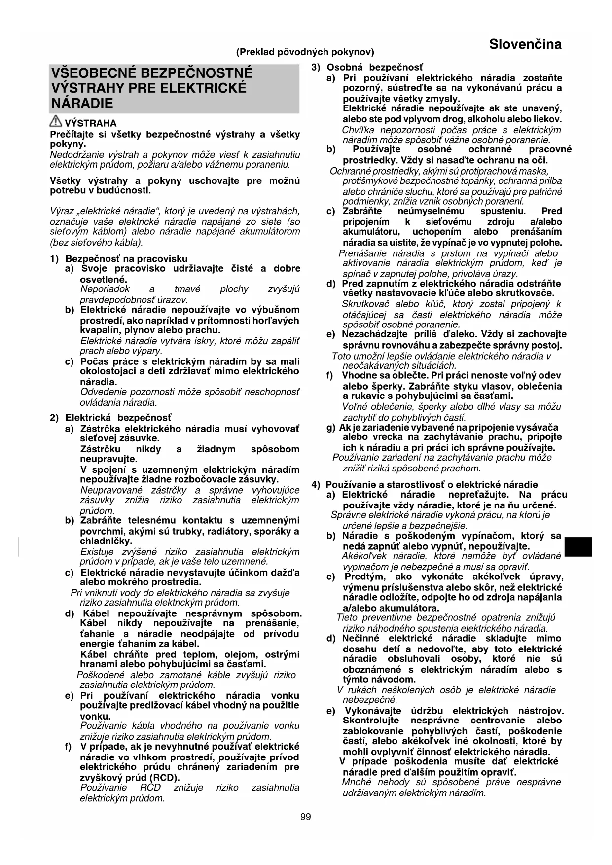 NÁRADIE VÝSTRAHA Prečítajte si všetky bezpečnostné výstrahy a všetky pokyny. Nedodržanie výstrah a pokynov môže viesť k zasiahnutiu elektrickým prúdom, požiaru a/alebo vážnemu poraneniu. Všetky výstrahy a pokyny uschovajte pre možnú potrebu v budúcnosti. Výraz „elektrické náradie“, ktorý je uvedený na výstrahách, označuje vaše elektrické náradie napájané zo siete (so sieťovým káblom) alebo náradie napájané akumulátorom (bez sieťového kábla).