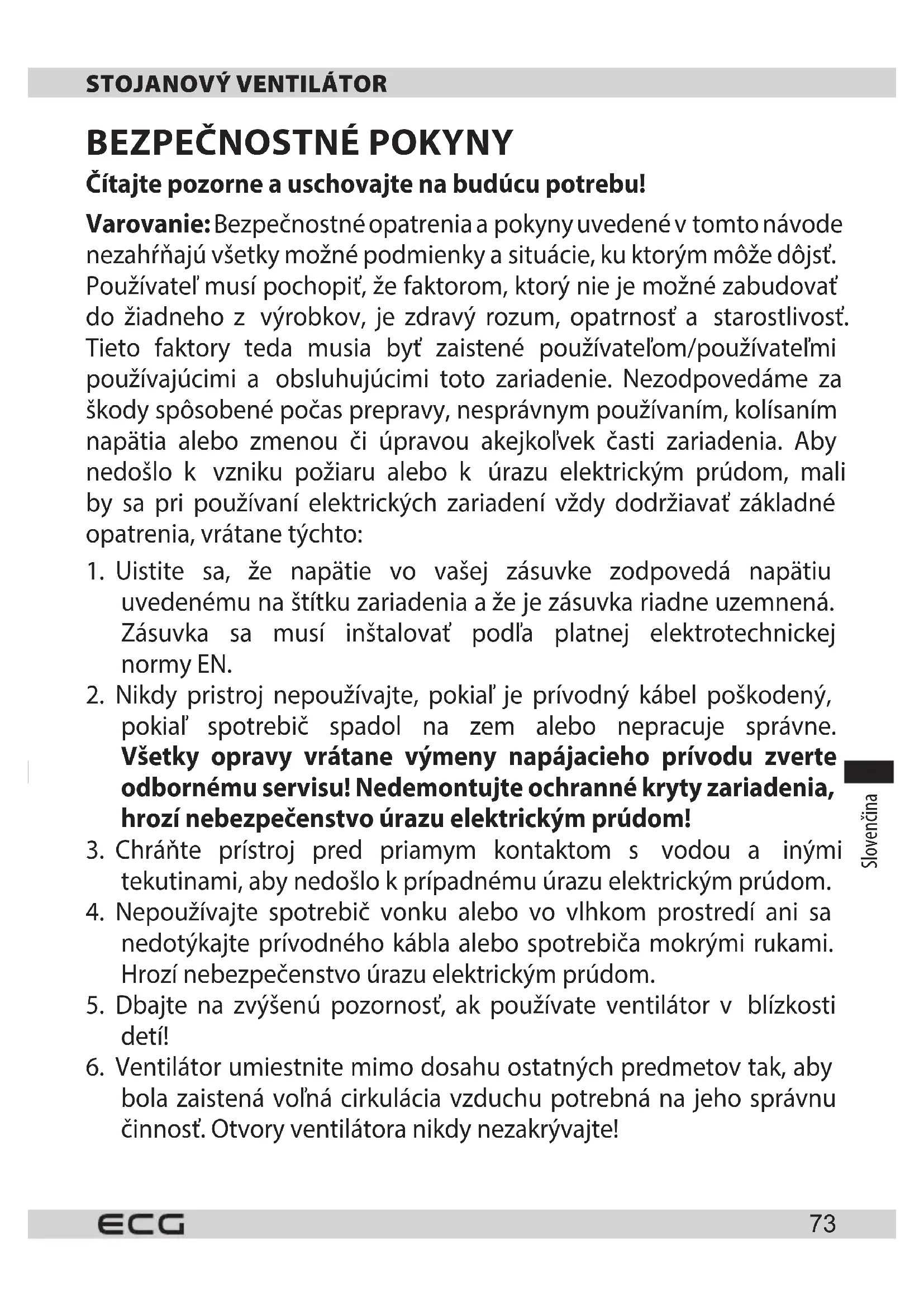 Baliaci papier avlnitá lepenka – odovzdajte do zberných surovín. Prebalová fólia, PE vrecká, plastové diely – vyhadzujte do kontajnerov na plasty. LIKVIDÁCIA VÝROBKU PO SKONČENÍ ŽIVOTNOSTI Likvidácia použitých elektrických aelektronických zariadení (platí včlenských krajinách EÚ aďalších európskych krajinách so zavedeným systémom triedenia odpadu) Vyobrazený symbol na produkte alebo na obale znamená, že sproduktom by sa nemalo nakladať ako sdomovým odpadom. Produkt odovzdajte na miesto určené na recykláciu elektrických aelektronických zariadení. Správnou likvidáciou produktu zabránite negatívnym vplyvom na ľudské zdravie a životné prostredie. Recyklácia materiálov prispieva kochrane prírodných zdrojov. Viac informácií orecyklácii tohto produktu vám poskytne obecný úrad, organizácia na spracovanie domového odpadu alebo predajné miesto, kde ste produkt kúpili. Tento výrobok spĺňa požiadavky smerníc EÚ o elektromagnetickej kompatibilite a elektrickej bezpečnosti. Návod na obsluhu je k dispozícii na webových stránkach www.ecg-electro.eu. Zmena textu a technických parametrov vyhradená. 08/05Slovenščina Slovenščina