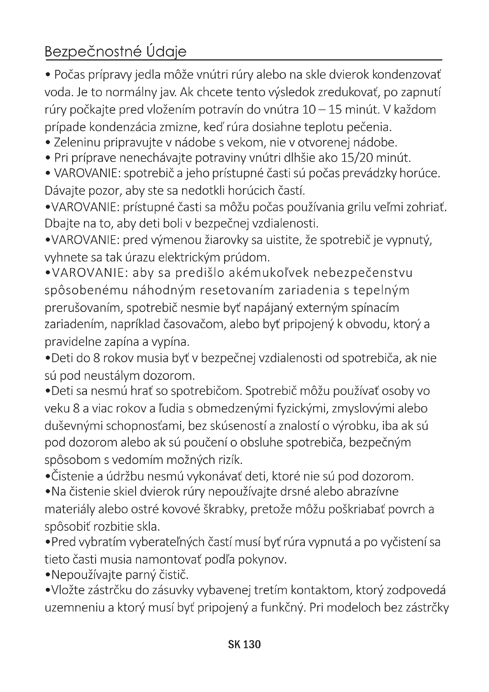 Zhrnutie SK 1321. Všeobecné pokyny Ďakujeme vám, že ste sa rozhodli pre jeden z našich výrobkov. V záujme dosiahnutia čo najlepších výsledkov s rúrou si pozorne prečítajte tento návod a uschovajte ho pre budúce použitie. Pred inštaláciou rúry si poznamenajte sériové číslo, aby ste ho mohli poskytnúť zákazníckym službám, ak bude potrebná nejaká oprava. Po vybratí rúry z obalu skontrolujte, či nebola počas prepravy poškodená. Ak máte pochybnosti, rúru nepoužívajte a poraďte sa s kvalifikovaným technikom. Všetok obalový materiál (plastové vrecia, polystyrén, klince), uchovávajte mimo dosahu detí. Keď sa rúra zapne prvýkrát, môže sa vytvoriť silne zapáchajúci dym, čo je spôsobené tým, že sa lepidlá na izolačných doskách okolo rúry zahrejú po prvýkrát. Je to úplne normálne a ak k tomu dôjde, je potrebné pred vložením jedla do rúry počkať, kým sa dym nerozptýli. Výrobca nenesie žiadnu zodpovednosť v prípadoch, keď sa nedodržiavajúpokynyuvedené v tomtodokumente POZNÁMKA: funkcie rúry, jej vlastnosti a príslušenstvo uvedené v tejto príručke sa budú líšiť v závislosti od modelu, ktorý stesi zakúpili.
