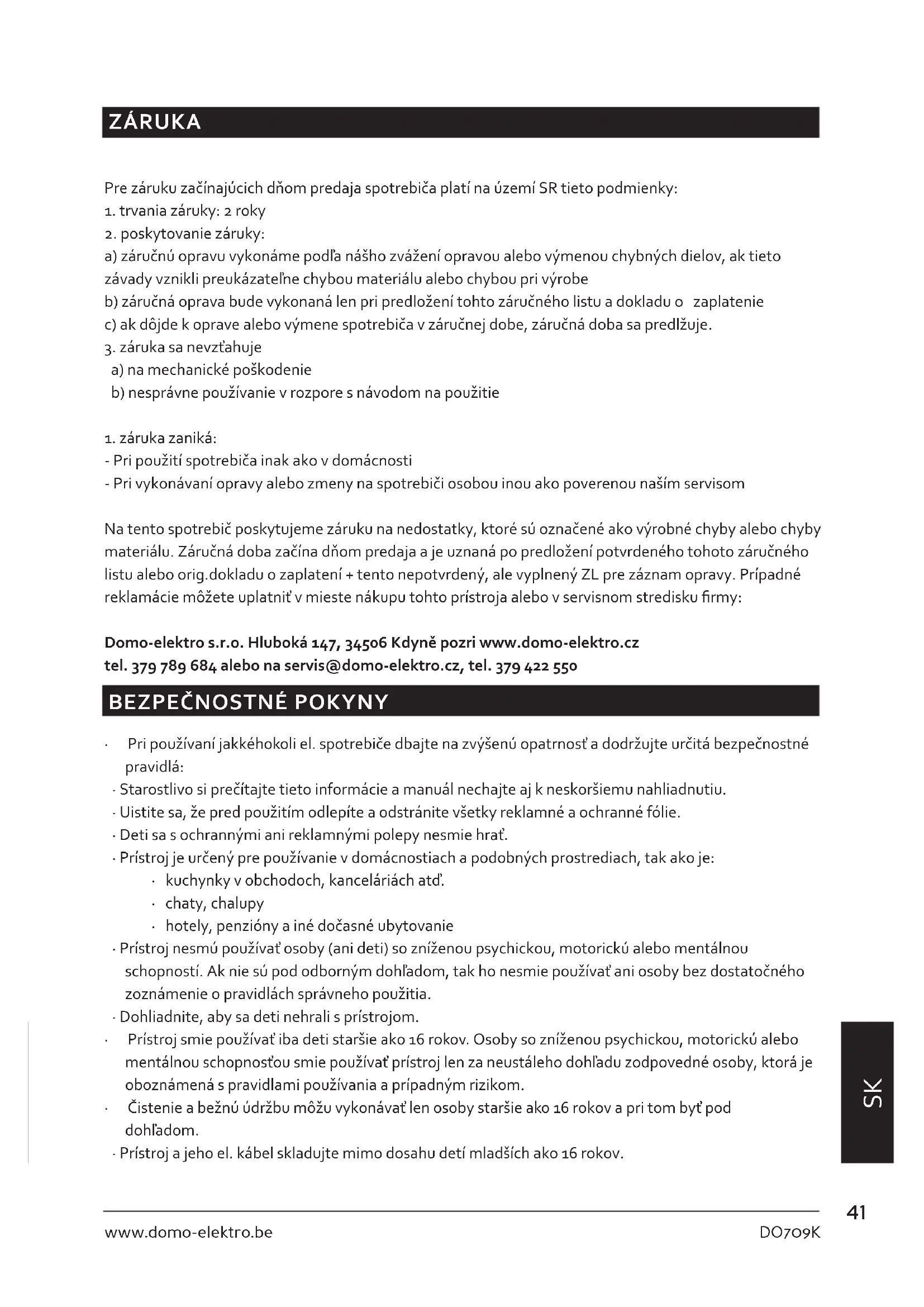 - Pri použití spotrebiča inak ako v domácnosti - Pri vykonávaní opravy alebo zmeny na spotrebiči osobou inou ako poverenou naším servisom Na tento spotrebič poskytujeme záruku na nedostatky, ktoré sú označené ako výrobné chyby alebo chyby materiálu. Záručná doba začína dňom predaja a je uznaná po predložení potvrdeného tohoto záručného listu alebo orig.dokladu o zaplatení + tento nepotvrdený, ale vyplnený ZL pre záznam opravy. Prípadné reklamácie môžete uplatniť v mieste nákupu tohto prístroja alebo v servisnom stredisku rmy: Domo-elektro s.r.o. Hluboká 147, 34506 Kdyně pozri www.domo-elektro.cz tel. 379 789 684 alebo na servis@domo-elektro.cz, tel. 379 422 550