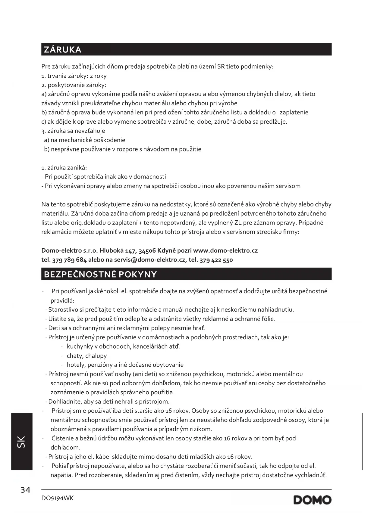 NÁVOD NA OBSLUHU DO9194WK DOMO