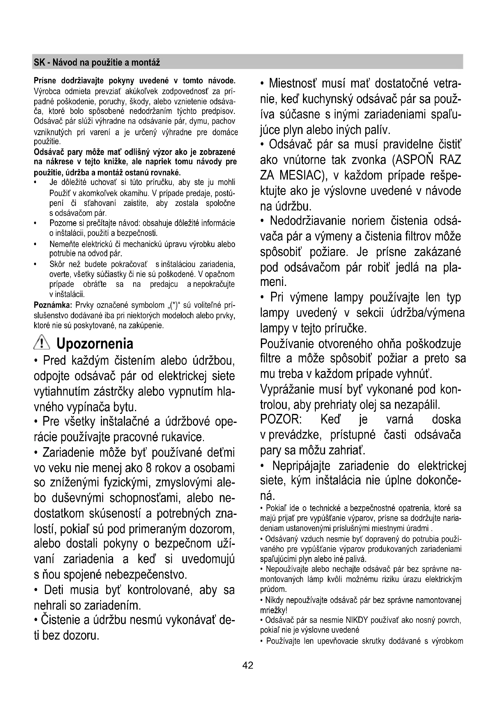 Opět namontujte mřítku. Jestliže osvětlení nefunguje, dříve než zavoláte servis si ověř- te, zda jste správně nasadili žárovky do uložení.42 SK - Návod na použitie a montáž Prísne dodržiavajte pokyny uvedené v tomto návode. Výrobca odmieta prevziať akúkoľvek zodpovednosť za prí- padné poškodenie, poruchy, škody, alebo vznietenie odsáva- ča, ktoré bolo spôsobené nedodržaním týchto predpisov. Odsávač pár slúži výhradne na odsávanie pár, dymu, pachov vzniknutých pri varení a je určený výhradne pre domáce použitie. Odsávač pary môže mať odlišný výzor ako je zobrazené na nákrese v tejto knižke, ale napriek tomu návody pre použitie, údržba a montáž ostanú rovnaké.