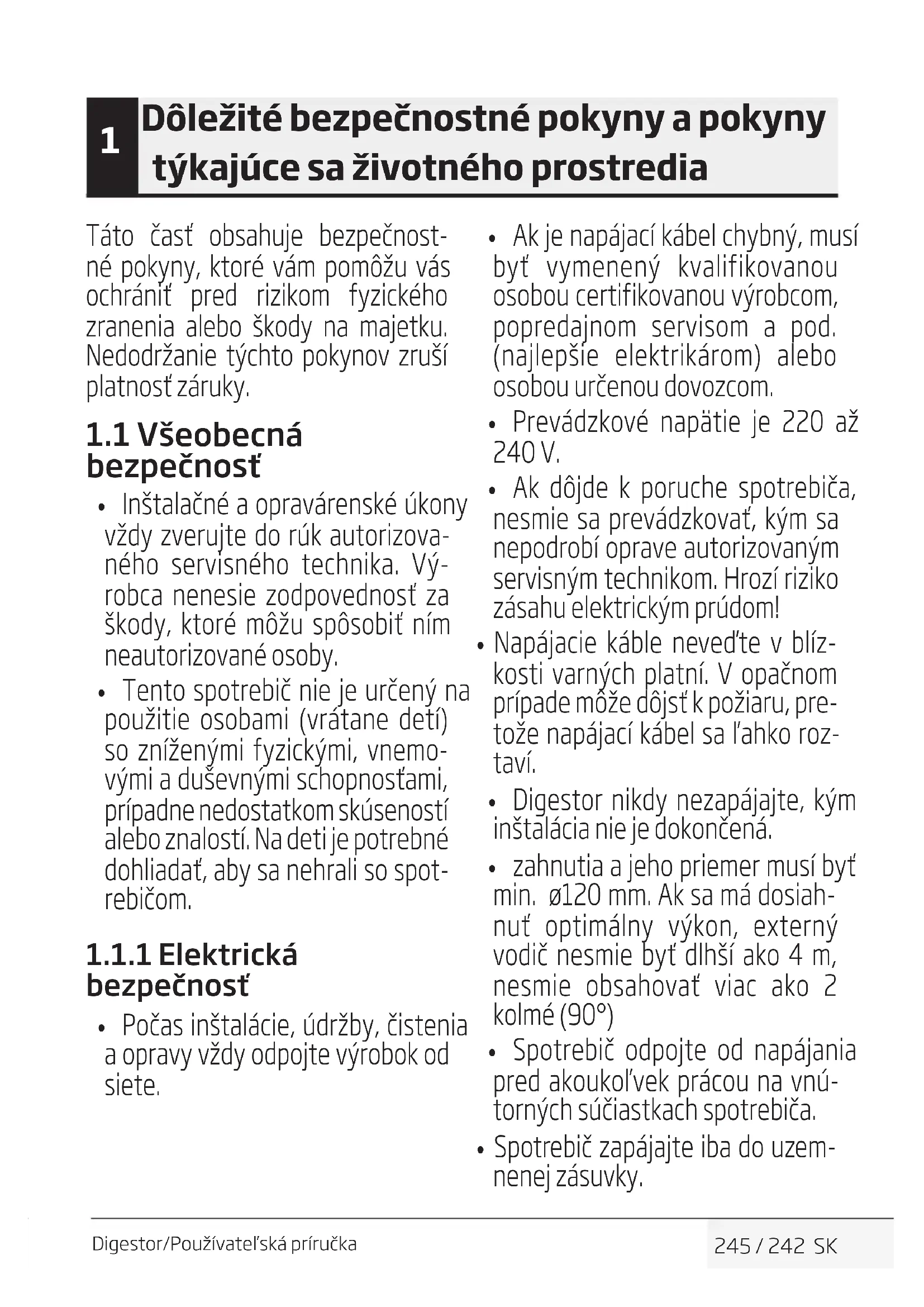 Varovanie pred zásahom elektrickým prúdom. Upozornenie na horúce povrchy.Digestor/Používateľská príručka 244 / 242 SK OBSAH 1 Dôležité bezpečnostné pokyny a pokyny týkajúce sa životného prostredia 229-232