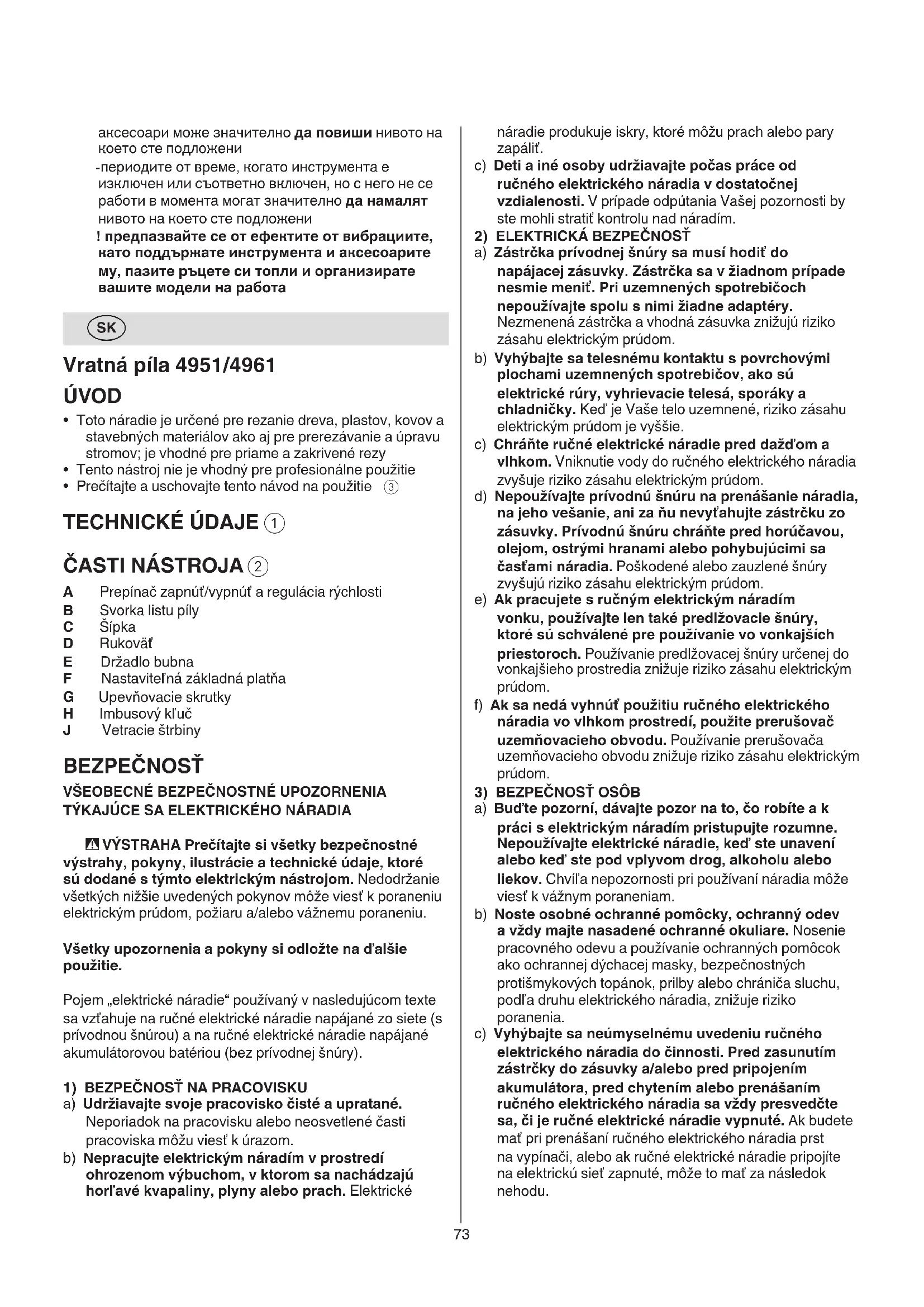 A Prepínač zapnúť/vypnúť a regulácia rýchlosti B Svorka listu píly C Šípka D Rukoväť E Držadlo bubna F Nastaviteľná základná platňa G Upevňovacie skrutky H Imbusový kľuč J Vetracie štrbiny BEZPEČNOSŤ