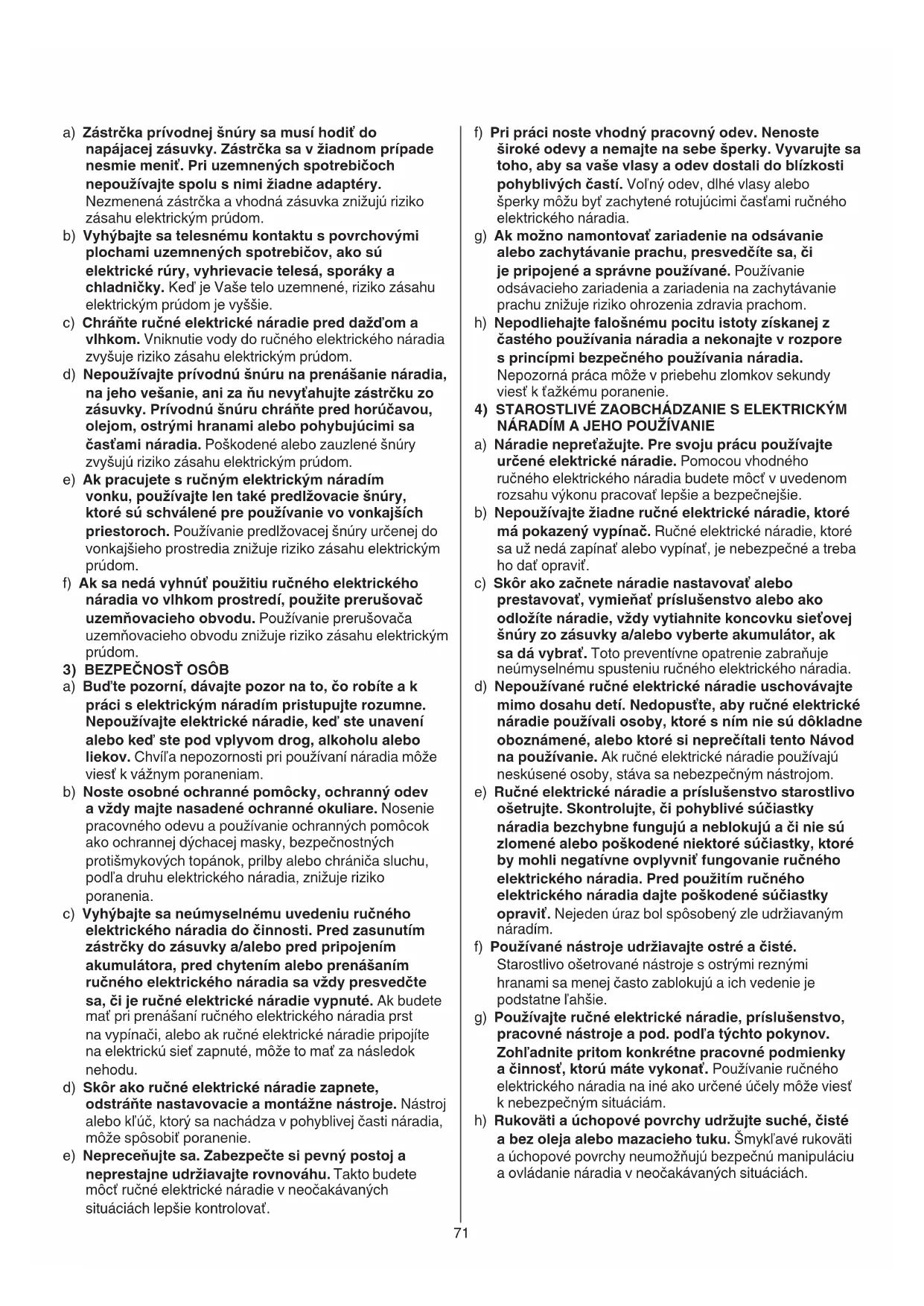 a) Buďte pozorní, dávajte pozor na to, čo robíte a k práci s elektrickým náradím pristupujte rozumne. Nepoužívajte elektrické náradie, keď ste unavení alebo keď ste pod vplyvom drog, alkoholu alebo liekov. Chvíľa nepozornosti pri používaní náradia môže viesť k vážnym poraneniam. b) Noste osobné ochranné pomôcky, ochranný odev a vždy majte nasadené ochranné okuliare. Nosenie pracovného odevu a používanie ochranných pomôcok ako ochrannej dýchacej masky, bezpečnostných protišmykových topánok, prilby alebo chrániča sluchu, podľa druhu elektrického náradia, znižuje riziko poranenia. c) Vyhýbajte sa neúmyselnému uvedeniu ručného elektrického náradia do činnosti. Pred zasunutím zástrčky do zásuvky a/alebo pred pripojením akumulátora, pred chytením alebo prenášaním ručného elektrického náradia sa vždy presvedčte sa, či je ručné elektrické náradie vypnuté. Ak budete mať pri prenášaní ručného elektrického náradia prst na vypínači, alebo ak ručné elektrické náradie pripojíte na elektrickú sieť zapnuté, môže to mať za následok nehodu. d) Skôr ako ručné elektrické náradie zapnete, odstráňte nastavovacie a montážne nástroje. Nástroj alebo kľúč, ktorý sa nachádza v pohyblivej časti náradia, môže spôsobiť poranenie. e) Nepreceňujte sa. Zabezpečte si pevný postoj a neprestajne udržiavajte rovnováhu. Takto budete môcť ručné elektrické náradie v neočakávaných situáciách lepšie kontrolovať.72