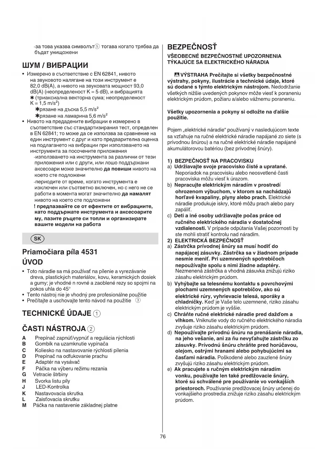 A Prepínač zapnúť/vypnúť a regulácia rýchlosti B Gombík na uzamknutie vypínača C Koliesko na nastavovanie rýchlosti pílenia D Prepínač na odfukovanie prachu E Adaptér na vysávač F Páčka na výberu režimu rezania G Vetracie štrbiny H Svorka listu píly J LED-Kontrolka K Nastavovacia skrutka L Zaisťovacia skrutku M Páčka na nastavenie základnej platne77 c) Skôr ako začnete náradie nastavovať alebo prestavovať, vymieňať príslušenstvo alebo ako odložíte náradie, vždy vytiahnite koncovku sieťovej šnúry zo zásuvky a/alebo vyberte akumulátor, ak sa dá vybrať. Toto preventívne opatrenie zabraňuje neúmyselnému spusteniu ručného elektrického náradia. d) Nepoužívané ručné elektrické náradie uschovávajte mimo dosahu detí. Nedopusťte, aby ručné elektrické náradie používali osoby, ktoré s ním nie sú dôkladne oboznámené, alebo ktoré si neprečítali tento Návod na používanie. Ak ručné elektrické náradie používajú neskúsené osoby, stáva sa nebezpečným nástrojom. e) Ručné elektrické náradie a príslušenstvo starostlivo ošetrujte. Skontrolujte, či pohyblivé súčiastky náradia bezchybne fungujú a neblokujú a či nie sú zlomené alebo poškodené niektoré súčiastky, ktoré by mohli negatívne ovplyvniť fungovanie ručného elektrického náradia. Pred použitím ručného elektrického náradia dajte poškodené súčiastky opraviť. Nejeden úraz bol spôsobený zle udržiavaným náradím. f) Používané nástroje udržiavajte ostré a čisté. Starostlivo ošetrované nástroje s ostrými reznými hranami sa menej často zablokujú a ich vedenie je podstatne ľahšie. g) Používajte ručné elektrické náradie, príslušenstvo, pracovné nástroje a pod. podľa týchto pokynov. Zohľadnite pritom konkrétne pracovné podmienky a činnosť, ktorú máte vykonať. Používanie ručného elektrického náradia na iné ako určené účely môže viesť k nebezpečným situáciám. h) Rukoväti a úchopové povrchy udržujte suché, čisté a bez oleja alebo mazacieho tuku. Šmykľavé rukoväti a úchopové povrchy neumožňujú bezpečnú manipuláciu a ovládanie náradia v neočakávaných situáciách.