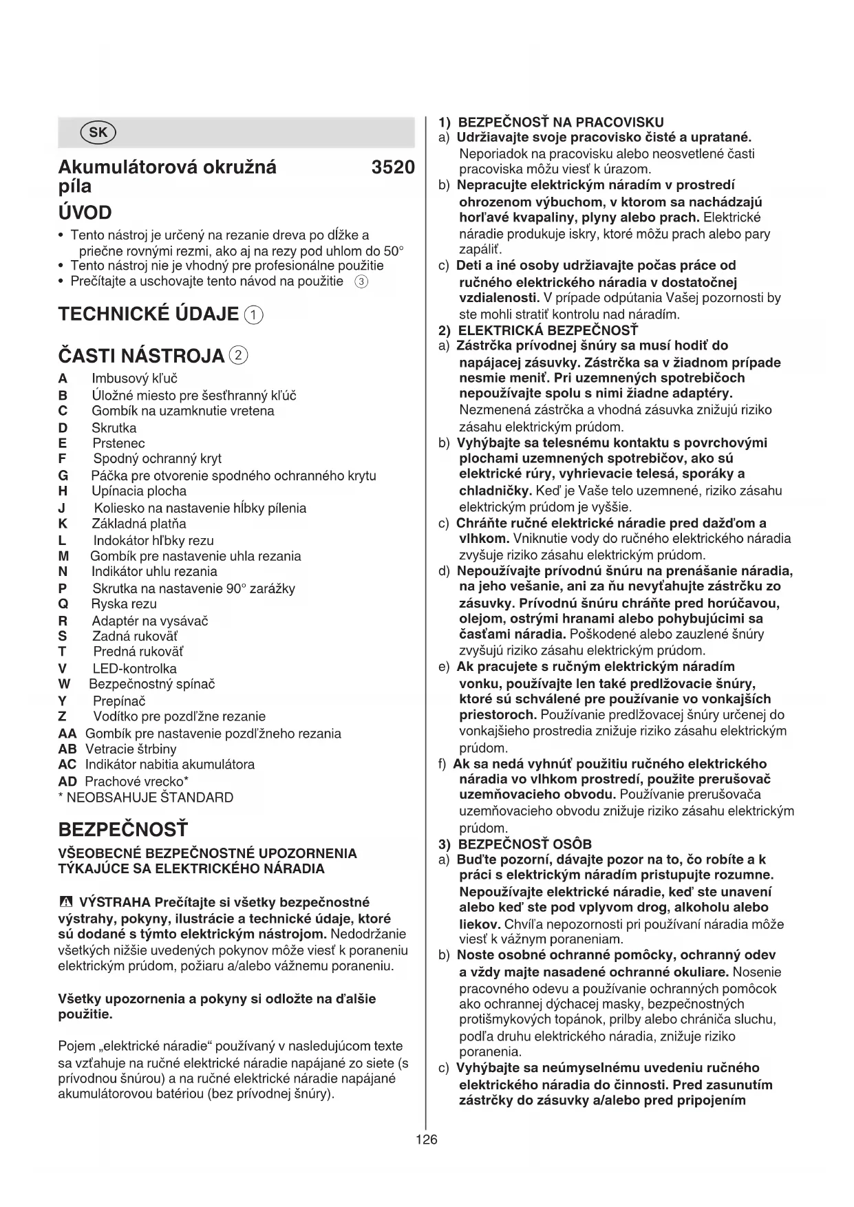 TÝKAJÚCE SA ELEKTRICKÉHO NÁRADIA - VÝSTRAHA Prečítajte si všetky bezpečnostné výstrahy, pokyny, ilustrácie a technické údaje, ktoré sú dodané s týmto elektrickým nástrojom. Nedodržanie všetkých nižšie uvedených pokynov môže viesť k poraneniu elektrickým prúdom, požiaru a/alebo vážnemu poraneniu. Všetky upozornenia a pokyny si odložte na ďalšie použitie. Pojem „elektrické náradie“ používaný v nasledujúcom texte sa vzťahuje na ručné elektrické náradie napájané zo siete (s prívodnou šnúrou) a na ručné elektrické náradie napájané akumulátorovou batériou (bez prívodnej šnúry).127 f) Používané nástroje udržiavajte ostré a čisté. Starostlivo ošetrované nástroje s ostrými reznými hranami sa menej často zablokujú a ich vedenie je podstatne ľahšie. g) Používajte ručné elektrické náradie, príslušenstvo, pracovné nástroje a pod. podľa týchto pokynov. Zohľadnite pritom konkrétne pracovné podmienky a činnosť, ktorú máte vykonať. Používanie ručného elektrického náradia na iné ako určené účely môže viesť k nebezpečným situáciám. h) Rukoväti a úchopové povrchy udržujte suché, čisté a bez oleja alebo mazacieho tuku. Šmykľavé rukoväti a úchopové povrchy neumožňujú bezpečnú manipuláciu a ovládanie náradia v neočakávaných situáciách.