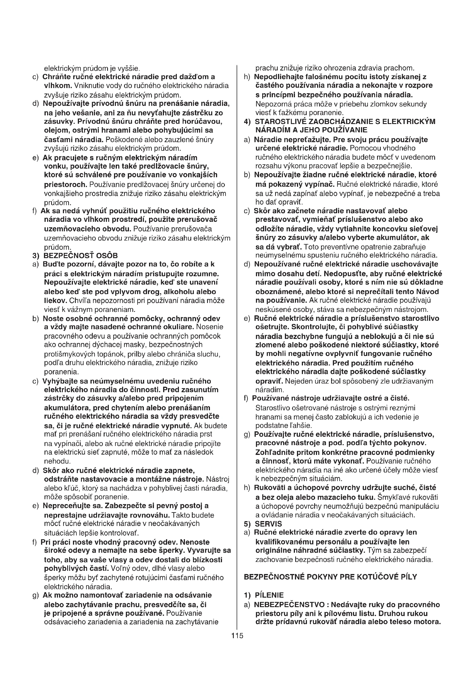 a) Buďte pozorní, dávajte pozor na to, čo robíte a k práci s elektrickým náradím pristupujte rozumne. Nepoužívajte elektrické náradie, keď ste unavení alebo keď ste pod vplyvom drog, alkoholu alebo liekov. Chvíľa nepozornosti pri používaní náradia môže viesť k vážnym poraneniam. b) Noste osobné ochranné pomôcky, ochranný odev a vždy majte nasadené ochranné okuliare. Nosenie pracovného odevu a používanie ochranných pomôcok ako ochrannej dýchacej masky, bezpečnostných protišmykových topánok, prilby alebo chrániča sluchu, podľa druhu elektrického náradia, znižuje riziko poranenia. c) Vyhýbajte sa neúmyselnému uvedeniu ručného elektrického náradia do činnosti. Pred zasunutím zástrčky do zásuvky a/alebo pred pripojením akumulátora, pred chytením alebo prenášaním ručného elektrického náradia sa vždy presvedčte sa, či je ručné elektrické náradie vypnuté. Ak budete mať pri prenášaní ručného elektrického náradia prst na vypínači, alebo ak ručné elektrické náradie pripojíte na elektrickú sieť zapnuté, môže to mať za následok nehodu. d) Skôr ako ručné elektrické náradie zapnete, odstráňte nastavovacie a montážne nástroje. Nástroj alebo kľúč, ktorý sa nachádza v pohyblivej časti náradia, môže spôsobiť poranenie. e) Nepreceňujte sa. Zabezpečte si pevný postoj a neprestajne udržiavajte rovnováhu. Takto budete môcť ručné elektrické náradie v neočakávaných situáciách lepšie kontrolovať. f) Pri práci noste vhodný pracovný odev. Nenoste široké odevy a nemajte na sebe šperky. Vyvarujte sa toho, aby sa vaše vlasy a odev dostali do blízkosti pohyblivých častí. Voľný odev, dlhé vlasy alebo šperky môžu byť zachytené rotujúcimi časťami ručného elektrického náradia. g) Ak možno namontovať zariadenie na odsávanie alebo zachytávanie prachu, presvedčíte sa, či je pripojené a správne používané. Používanie odsávacieho zariadenia a zariadenia na zachytávanie116 dozadu kým sa kotúč otáča aby nedošlo k spätnému rázu. Skontrolujte opracovaný kus a upravte ho aby nedošlo k uviaznutiu kotúča. Vyhnite sa prerezaniu skrutiek alebo klincov. c) Keď znovu začnete píliť opracovaný kus, umiestnite pílový kotúč do vrubu a skontrolujte, či sa zuby píly voľne hýbu v materiáli. Ak kotúč uviazne, môže vyskočiť alebo spôsobiť spätný ráz z opracovaného kusu keď sa píla znovu zapne. d) Podporte veľké panely aby sa minimalizovalo riziko zaseknutia kotúča a spätného rázu. Veľké panely sa často ohnú pod vlastnou váhou. Obe strany panelu sa musia podporiť blízko čiary rezu a pri hranách panelu. e) Nepoužívajte tupé alebo poškodené kotúče. Nenaostrené alebo nesprávne nastavené kotúče vytvoria úzky vrub, spôsobujúci príliš veľké trenie, uviaznutie kotúča a spätný ráz. f) Zamykajúce páky na nastavenie hábky kotúča a úkosu sa musia tesne pripevniť pred začatím rezania. Ak sa nastavenie kotúča pošmykne počas rezania, môže spôsobiť uviaznutie kotúča a spätný ráz. g) Mimoriadne opatrný treba byť pri rezaní do existujúch (neznámych) stien alebo do iných neprehľadných miest. Zapichovaný pílový list môžu pri pílení zablokovať rôzne skryté objekty, čo môže spôsobiť spätný ráz.