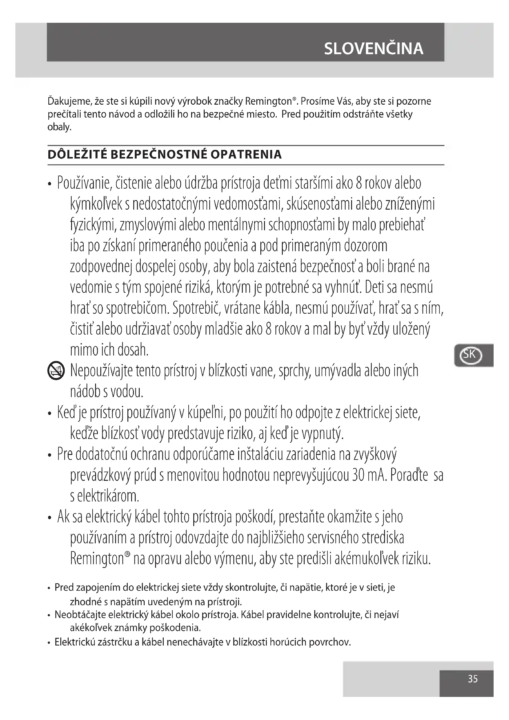 - Ak sa elektrický kábel tohto prístroja poškodí, prestaňte okamžite s jeho používaním a prístroj odovzdajte do najbližšieho servisného strediska Remington® na opravu alebo výmenu, aby ste predišli akémukoľvek riziku.