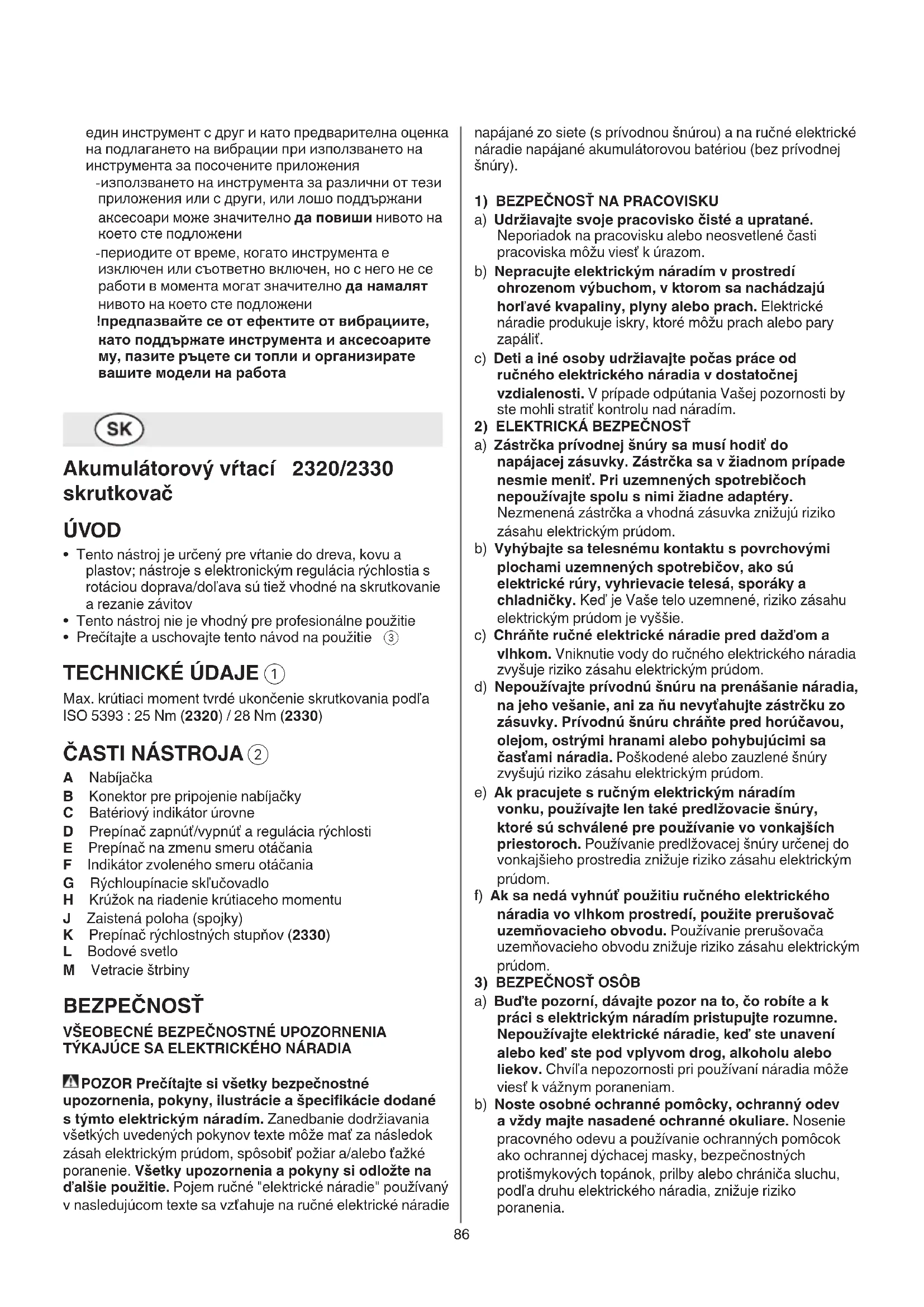 A Nabíjačka B Konektor pre pripojenie nabíjačky C Batériový indikátor úrovne D Prepínač zapnúť/vypnúť a regulácia rýchlosti E Prepínač na zmenu smeru otáčania F Indikátor zvoleného smeru otáčania G Rýchloupínacie skľučovadlo H Krúžok na riadenie krútiaceho momentu J Zaistená poloha (spojky) K Prepínač rýchlostných stupňov (2330) L Bodové svetlo M Vetracie štrbiny BEZPEČNOSŤ