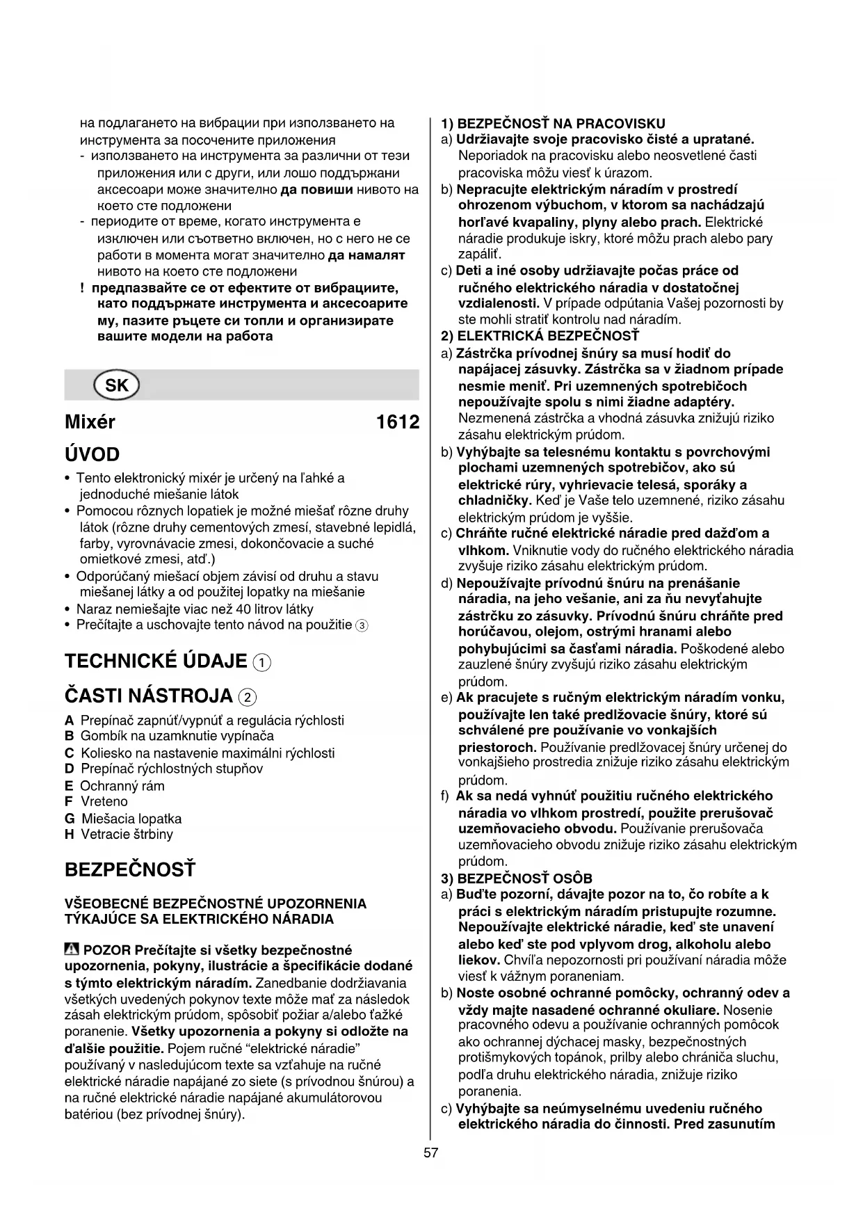 A Prepínač zapnúť/vypnúť a regulácia rýchlosti B Gombík na uzamknutie vypínača C Koliesko na nastavenie maximálni rýchlosti D Prepínač rýchlostných stupňov E Ochranný rám F Vreteno G Miešacia lopatka H Vetracie štrbiny BEZPEČNOSŤ