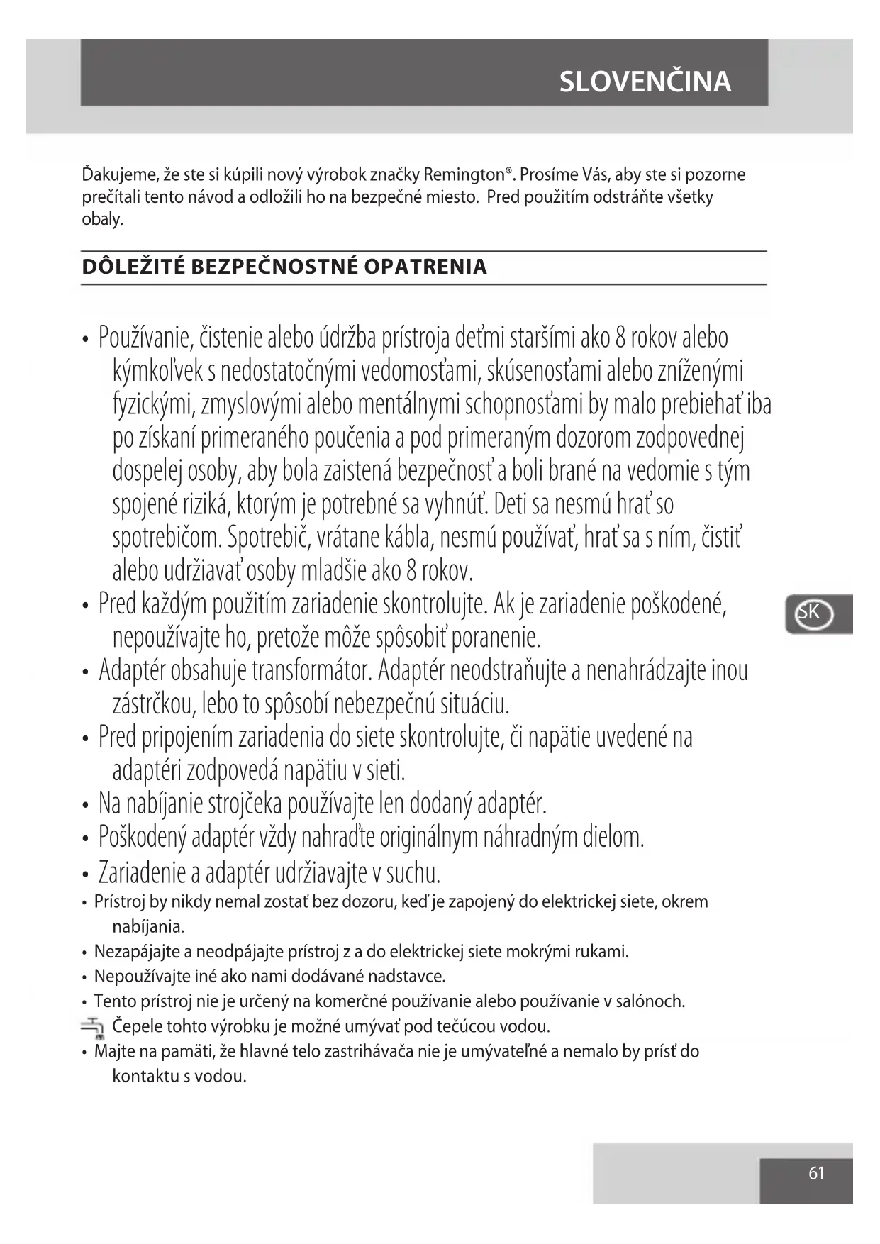 - Tento prístroj nie je určený na komerčné používanie alebo používanie v salónoch. Čepele tohto výrobku je možné umývať pod tečúcou vodou.