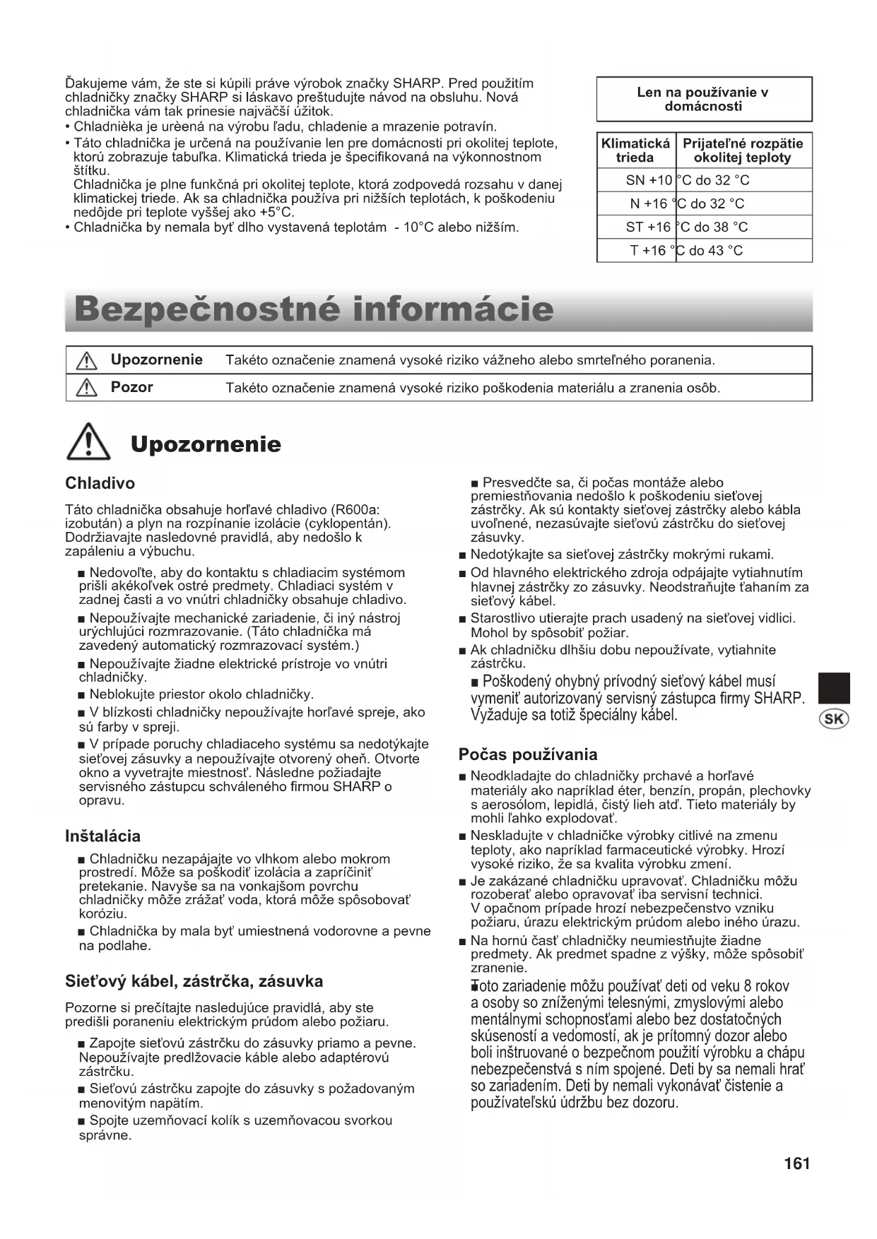Toto zariadenie môžu používať deti od veku 8 rokov a osoby so zníženými telesnými, zmyslovými alebo mentálnymi schopnosťami alebo bez dostatočných skúseností a vedomostí, ak je prítomný dozor alebo boli inštruované o bezpečnom použití výrobku a chápu nebezpečenstvá s ním spojené. Deti by sa nemali hrať so zariadením. Deti by nemali vykonávať čistenie a používateľskú údržbu bez dozoru. Klimatická trieda Prijateľné rozpätie okolitej teploty SN +10 °C do 32 °C N +16 °C do 32 °C ST +16 °C do 38 °C T +16 °C do 43 °C Bezpečnostné informácie Upozornenie Takéto označenie znamená vysoké riziko vážneho alebo smrteľného poranenia. Pozor Takéto označenie znamená vysoké riziko poškodenia materiálu a zranenia osôb. Upozornenie (B656)E_2.indb 161 2015/05/28 15:06:03162 Starostlivosť a čistenie ■ Odpojte chladničku od prívodu elektrickej energie kvôli zabráneniu zranenia elektrickym prúdom. ■ Nelejte vodu priamo na vonkajšiu skriňu ani do vnútra. Môže to viesť ku korózii a znehodnotiť elektrickú izoláciu. Problém ■ Ak cítite niečo spálené, urýchlene vytiahnite sieťovú zástrčku. Následne požiadajte servisného zástupcu schváleného rmou SHARP o opravu. ■ V prípade úniku plynu otvorte okno a vyvetrajte priestor. Nedotýkajte sa chladničky ani sieťovej zásuvky. Likvidácia ■ Zabezpečte, aby chladnička nepredstavovala žiadne nebezpečenstvo pre deti počas uskladnenia na likvidáciu. (Napr. odstráňte magnetické tesnenie dverí, aby sa predišlo zabuchnutiu detí.) ■ Táto chladnička by sa mala zlikvidovať požadovaným spôsobom. Vezmite chladničku na odborné recyklačné miesto so zameraním na horľavé chladivá a izoláciu výbušných plynov. Preprava ■ Ak montujete alebo prenášate chladničku, používajte ochrannú podložku, aby ste chránili podlahu pred poškodením. ■ Chladničku prenášajte za rukoväte umiestnené vzadu a naspodu. Ak zdvihnete chladničku nesprávnym spôsobom, môže spôsobiť zranenie. Pozor Počas používania ■ Nedotýkajte sa kompresora alebo jeho periférnych častí z dôvodu ich veľkej teploty počas prevádzky a tiež kvôli kovovým hranám, ktoré môžu spôsobiť poranenie. ■ Nedotýkajte sa potravín alebo kovových nádob v priestore mrazničky mokrými rukami. Môže to spôsobiť omrzliny. ■ Do priestoru mrazničky neodkladajte nápoje vo fľašiach alebo plechovkách. Najmä pri zapnutej funkcii „Expresné chladenie“ je vysoké riziko prasknutia sklenených iaš. ■ Na výrobu ľadových kociek používajte výlučne pitnú vodu. ■ Ak majú osoby ruky položené blízko dvier, nepokúšajte sa ich otvárať alebo zatvárať. Hrozí riziko privretia prstov do dverí. ■ Nevkladajte do priehradky na dverách príliš veľké predmety. Ak predmety z priehradky vypadnú, môžu spôsobiť zranenie. Indikátor teploty vzadu naspodu Táto chladnička je vybavená indikátorom teploty v priestore chladničky na reguláciu priemernej teploty v najchladnejšej zóne. Najchladnejšia zóna Tento symbol označuje najchladnejšiu zónu vo vnútornom priestore chladničky. (Priehradka na dverách, umiestnená v rovnakej výške, nie je súčasťou najchladnejšej zóny.) Kontrola teploty v najchladnejšej zóne Môžete vykonávať pravidelnú kontrolu, aby sa zaistila správna teplota v najchladnejšej zóne a v prípade potreby nastavila regulácia teploty chladničky. Na udržanie správnej teploty vo vnútri zariadenia je potrebné, aby bol indikátor teploty vždy MODRÝ. Ak sa farba indikátora teploty zmení na BIELU, teplota je príliš vysoká; v takomto prípade zvýšte nastavenie regulácie teploty chladničky a vyčkajte 6 hodín pred ďalšou kontrolou indikátora teploty. POZNÁMKA