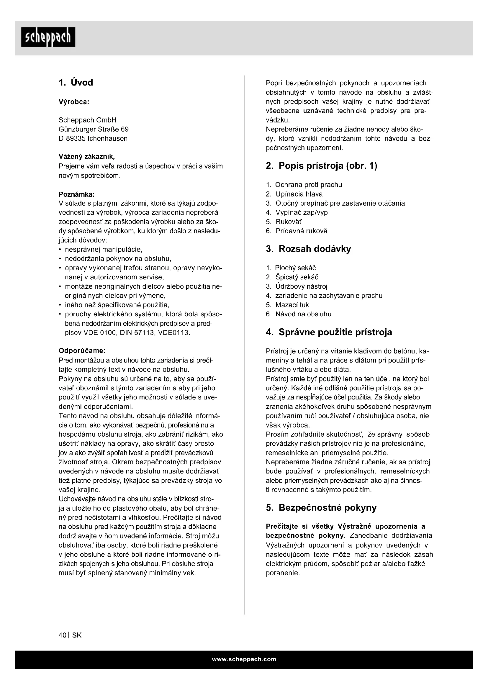 Výrobca: Scheppach GmbH Günzburger Straße 69 D-89335 Ichenhausen Vážený zákazník, Prajeme vám veľa radosti a úspechov v práci s vaším novým spotrebičom. Poznámka: V súlade s platnými zákonmi, ktoré sa týkajú zodpo- vednosti za výrobok, výrobca zariadenia nepreberá zodpovednosť za poškodenia výrobku alebo za ško- dy spôsobené výrobkom, ku ktorým došlo z nasledu- júcich dôvodov: