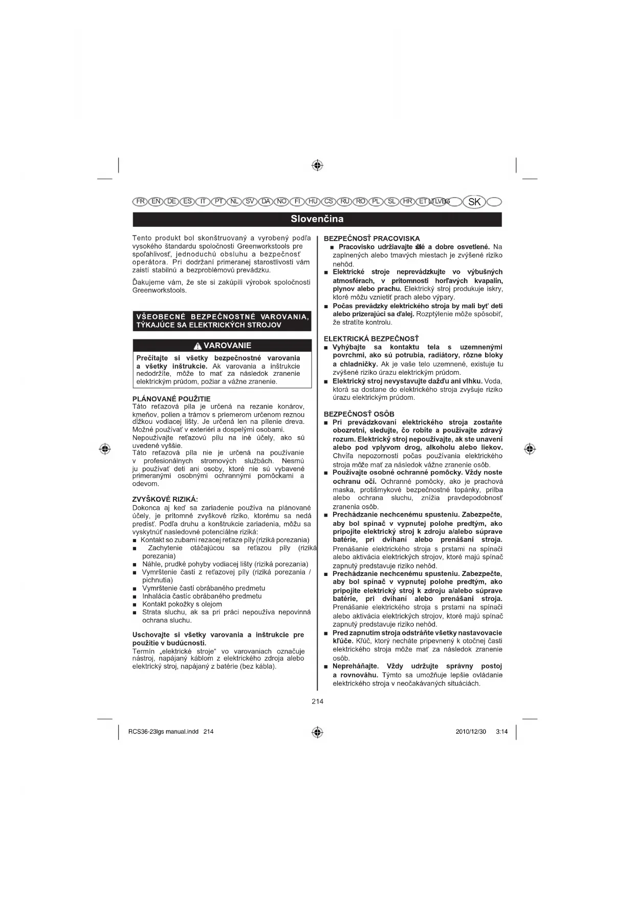 Pri |} elektrického stroja zostate obozretní, ~ o robíte a |}~_ ¯ rozum. Elektrický stroj |}~_ ak ste unavení alebo |} vplyvom } alkoholu alebo liekov. µ©`a nepozornosti poas =ì©>#> elektrického ?\@>b ì>>¹?|$+¹ì@>#?b_ >}~_ osobné ochranné pomôcky. ]_ noste ochranu oí. Ochranné pomôcky ako je prachová >?+> protišmykové bezpenostné topánky prilba alebo ochrana ?|=}= ©ì#> pravdepodobnos zranenia osôb. > nechcenému spusteniu. Zabezpete, aby bol spína v vypnutej polohe |¯ ako pripojíte elektrický stroj k }~ a/alebo | batérie, pri alebo prenášaní stroja. Prenášanie elektrického stroja s prstami na spínai alebo aktivácia elektrických strojov ktoré majú spína zapnutý predstavuje riziko nehôd. > nechcenému spusteniu. Zabezpete, aby bol spína v vypnutej polohe |¯ ako pripojíte elektrický stroj k }~ a/alebo | batérie, pri alebo prenášaní stroja. Prenášanie elektrického stroja s prstami na spínai alebo aktivácia elektrických strojov ktoré majú spína zapnutý predstavuje riziko nehôd. > zapnutím stroja }áte všetky nastavovacie kHe. K`ú ktorý necháte pripevnený k otonej asti elektrického stroja bì ma za následok zranenie osôb. Nepreháajte. ]_ ~_~ správny postoj a rovnováhu. Týmto sa umoìÿuje lepšie ovládanie elektrického stroja v neoakávaných situáciách. RCS36-23lgs manual.indd 214 2010/12/30 3:14215 Slovenina FR EN DE ES IT PT NL SV DA NO FI HU CS RU RO PL SL HR