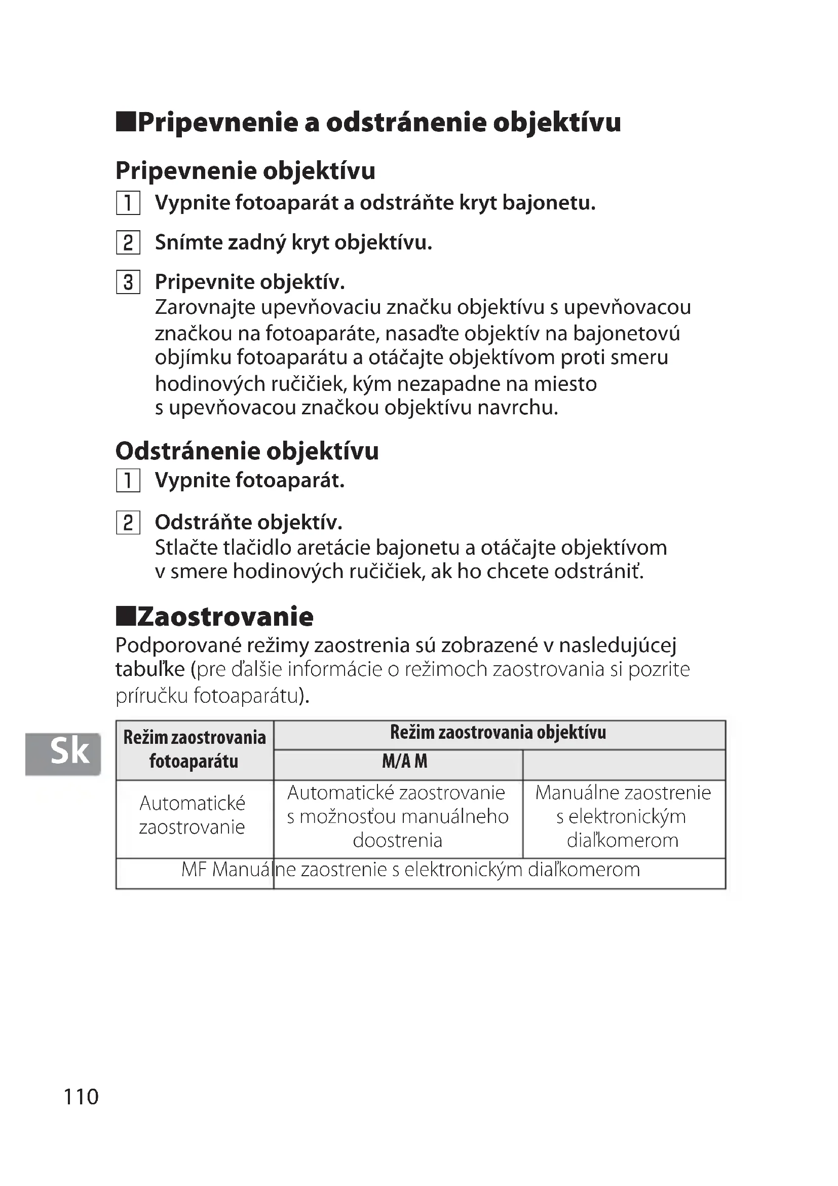 ■ Pripevnenie a odstránenie objektívu Pripevnenie objektívu Odstránenie objektívu ■ Zaostrovanie Podporované režimy zaostrenia sú zobrazené v nasledujúcej tabuľke (pre ďalšie informácie o režimoch zaostrovania si pozrite príručku fotoaparátu).