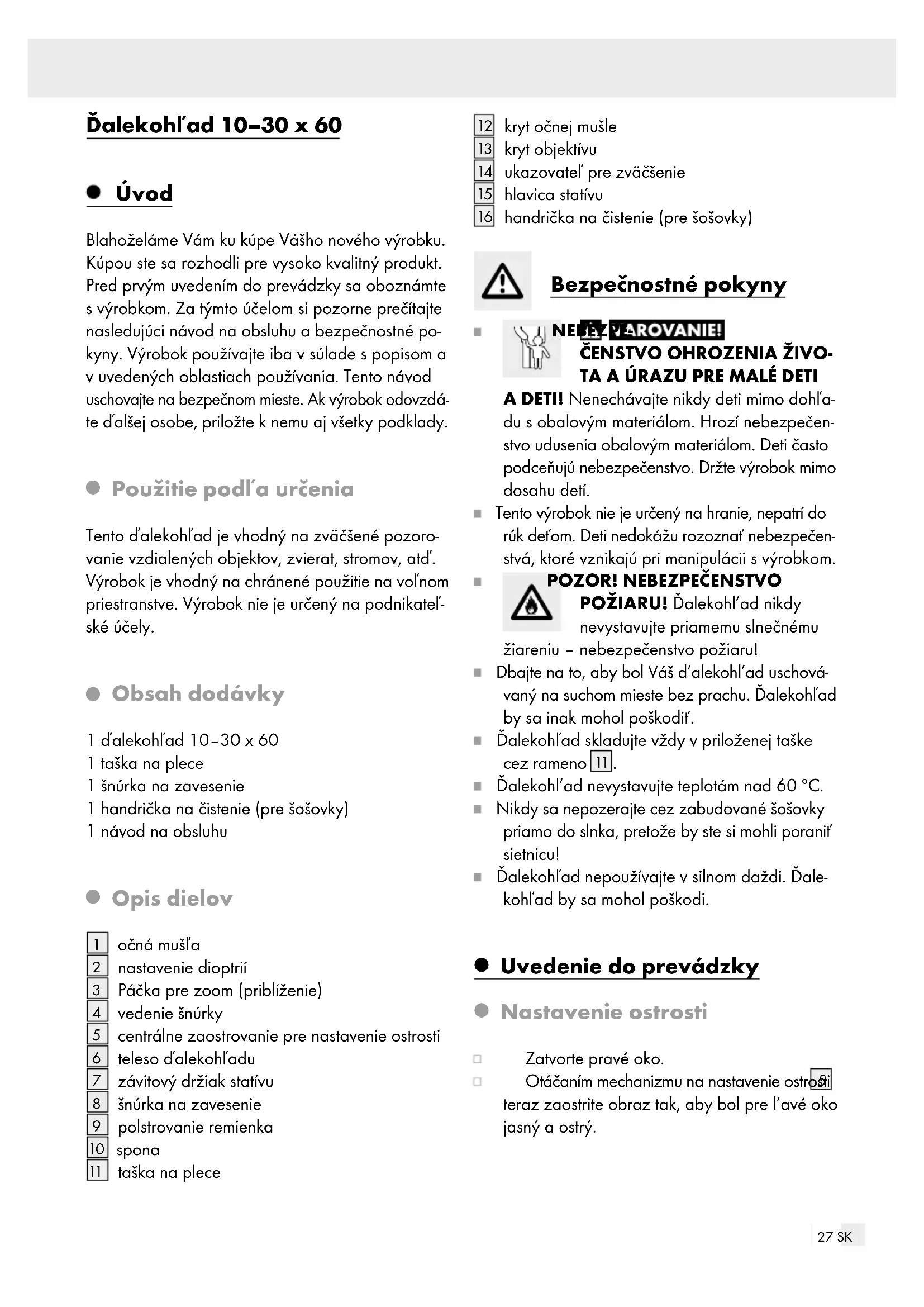Obsah dodávky 1 ďalekohľad 10–30 x 60 1 taška na plece 1 šnúrka na zavesenie 1 handrička na čistenie (pre šošovky) 1 návod na obsluhu