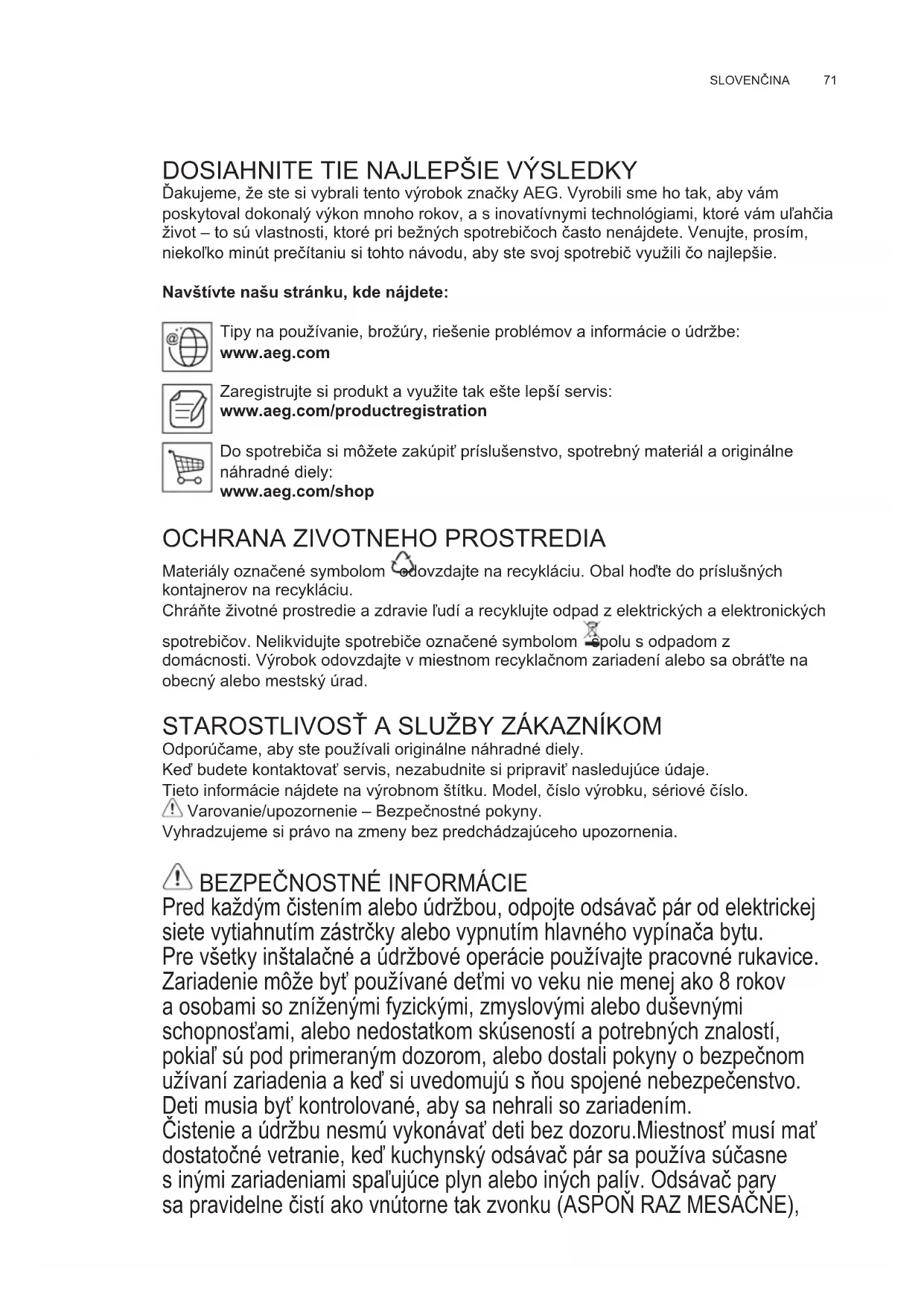 Pred každým čistením alebo údržbou, odpojte odsávač pár od elektrickej siete vytiahnutím zástrčky alebo vypnutím hlavného vypínača bytu. Pre všetky inštalačné a údržbové operácie používajte pracovné rukavice. Zariadenie môže byť používané deťmi vo veku nie menej ako 8 rokov a osobami so zníženými fyzickými, zmyslovými alebo duševnými schopnosťami, alebo nedostatkom skúseností a potrebných znalostí, pokiaľ sú pod primeraným dozorom, alebo dostali pokyny o bezpečnom užívaní zariadenia a keď si uvedomujú s ňou spojené nebezpečenstvo. Deti musia byť kontrolované, aby sa nehrali so zariadením. Čistenie a údržbu nesmú vykonávať deti bez dozoru.Miestnosť musí mať dostatočné vetranie, keď kuchynský odsávač pár sa používa súčasne s inými zariadeniami spaľujúce plyn alebo iných palív. Odsávač pary sa pravidelne čistí ako vnútorne tak zvonku (ASPOŇ RAZ MESAČNE), SK NÁVOD NA POUŽÍVANIEwww.aeg.com