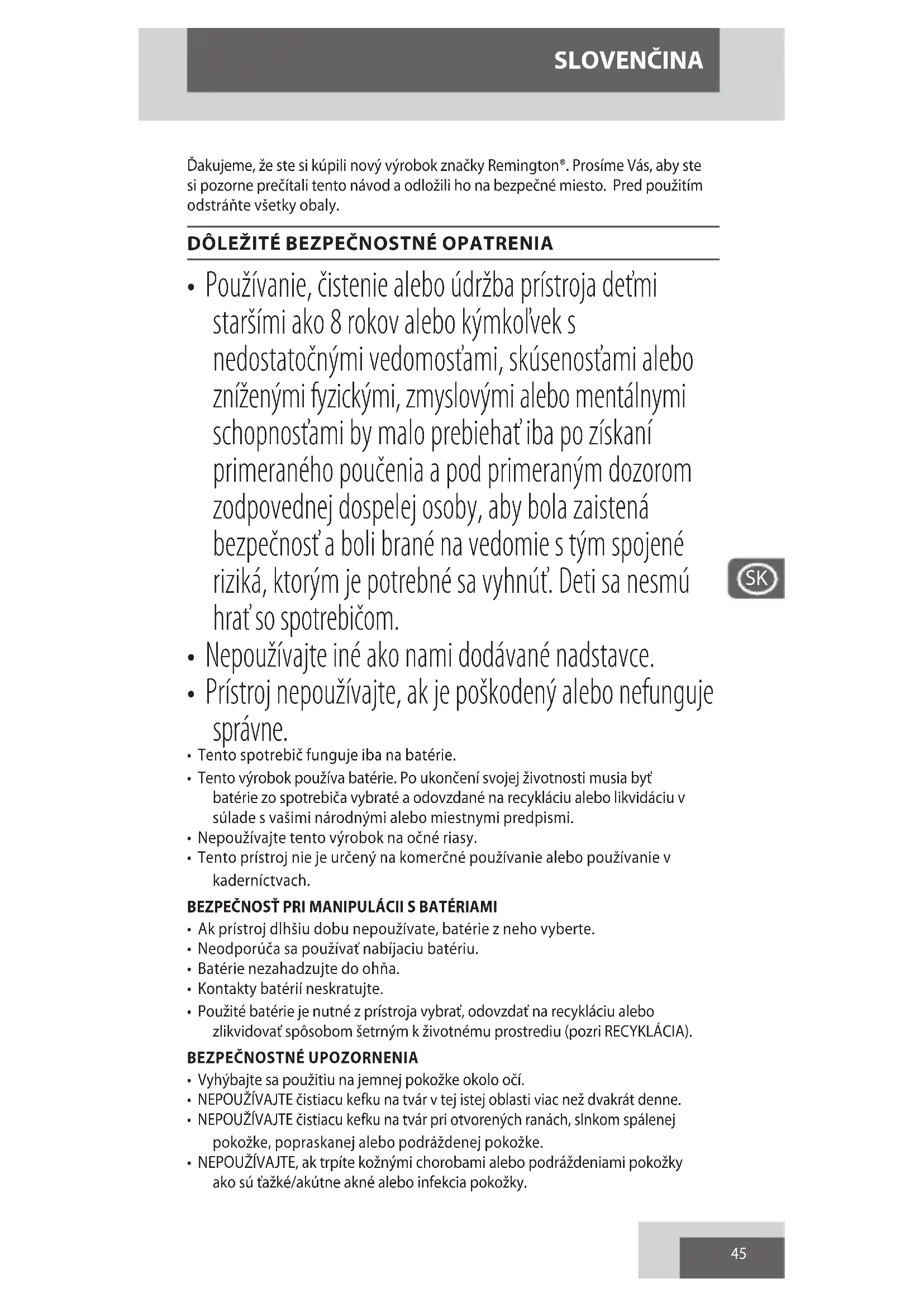 - Tento prístroj nie je určený na komerčné používanie alebo používanie v kaderníctvach. BEZPEČNOSŤ PRI MANIPULÁCII S BATÉRIAMI
