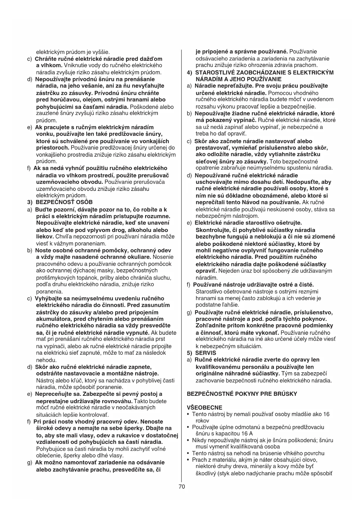 NÁRADÍM A JEHO POUŽÍVANIE a) Náradie nepreťažujte. Pre svoju prácu používajte určené elektrické náradie. Pomocou vhodného ručného elektrického náradia budete môcť v uvedenom rozsahu výkonu pracovať lepšie a bezpečnejšie. b) Nepoužívajte žiadne ručné elektrické náradie, ktoré má pokazený vypínač. Ručné elektrické náradie, ktoré sa už nedá zapínať alebo vypínať, je nebezpečné a treba ho dať opraviť. c) Skôr ako začnete náradie nastavovať alebo prestavovať, vymieňať príslušenstvo alebo skôr, ako odložíte náradie, vždy vytiahnite zástrčku sieťovej šnúry zo zásuvky. Toto bezpečnostné opatrenie zabraňuje neúmyselnému spusteniu náradia. d) Nepoužívané ručné elektrické náradie uschovávajte mimo dosahu detí. Nedopusťte, aby ručné elektrické náradie používali osoby, ktoré s ním nie sú dôkladne oboznámené, alebo ktoré si neprečítali tento Návod na používanie. Ak ručné elektrické náradie používajú neskúsené osoby, stáva sa nebezpečným nástrojom. e) Elektrické náradie starostlivo ošetrujte. Skontrolujte, či pohyblivé súčiastky náradia bezchybne fungujú a neblokujú a či nie sú zlomené alebo poškodené niektoré súčiastky, ktoré by mohli negatívne ovplyvniť fungovanie ručného elektrického náradia. Pred použitím ručného elektrického náradia dajte poškodené súčiastky opraviť. Nejeden úraz bol spôsobený zle udržiavaným náradím. f) Používané nástroje udržiavajte ostré a čisté. Starostlivo ošetrované nástroje s ostrými reznými hranami sa menej často zablokujú a ich vedenie je podstatne ľahšie. g) Používajte ručné elektrické náradie, príslušenstvo, pracovné nástroje a pod. podľa týchto pokynov. Zohľadnite pritom konkrétne pracovné podmienky a činnosť, ktorú máte vykonať. Používanie ručného elektrického náradia na iné ako určené účely môže viesť k nebezpečným situáciám.