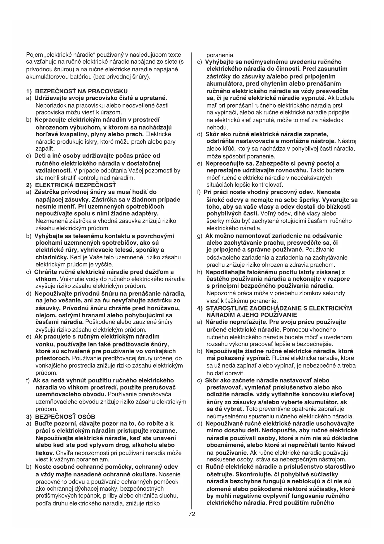 a) Buďte pozorní, dávajte pozor na to, čo robíte a k práci s elektrickým náradím pristupujte rozumne. Nepoužívajte elektrické náradie, keď ste unavení alebo keď ste pod vplyvom drog, alkoholu alebo liekov. Chvíľa nepozornosti pri používaní náradia môže viesť k vážnym poraneniam. b) Noste osobné ochranné pomôcky, ochranný odev a vždy majte nasadené ochranné okuliare. Nosenie pracovného odevu a používanie ochranných pomôcok ako ochrannej dýchacej masky, bezpečnostných protišmykových topánok, prilby alebo chrániča sluchu, podľa druhu elektrického náradia, znižuje riziko73