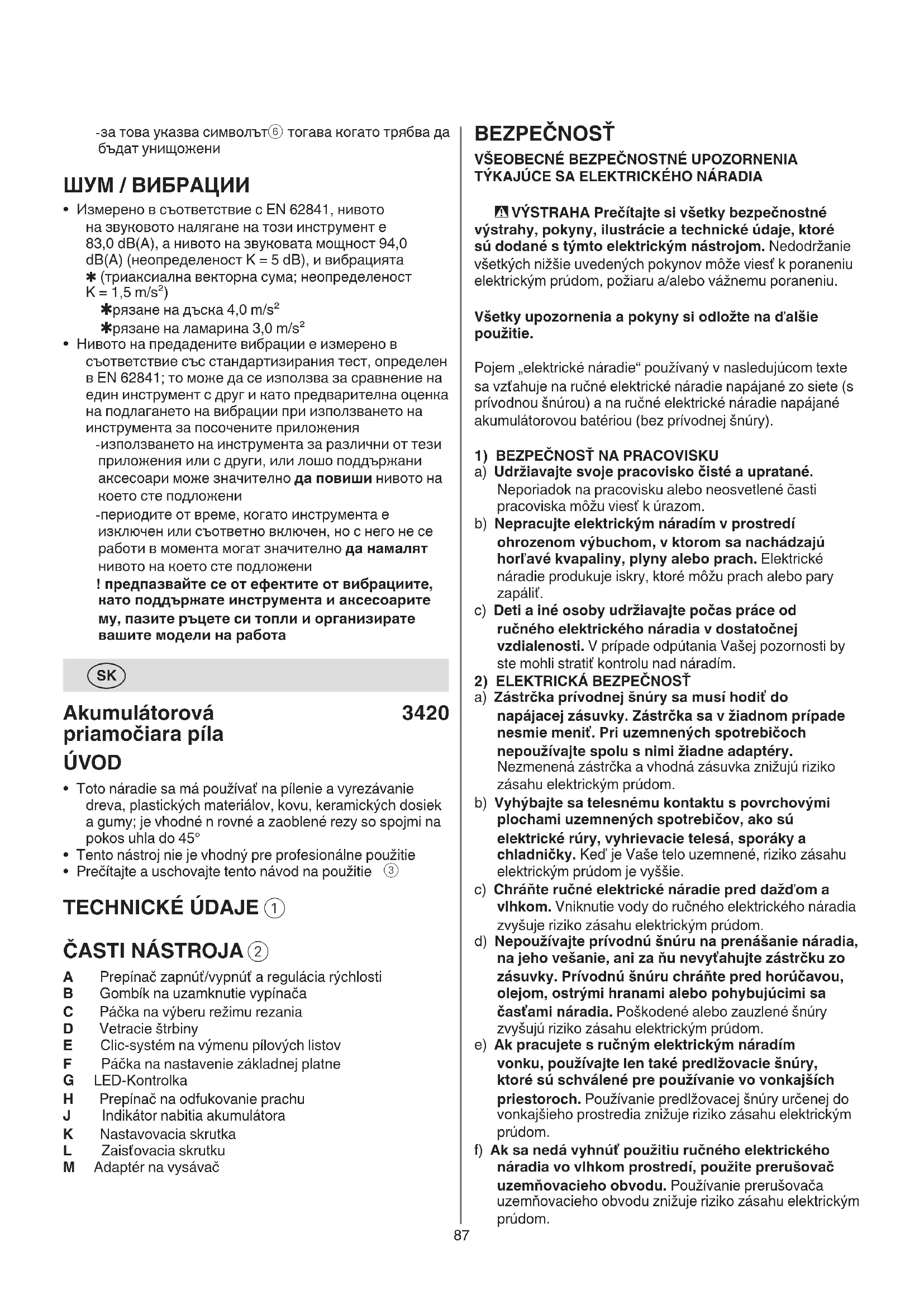 A Prepínač zapnúť/vypnúť a regulácia rýchlosti B Gombík na uzamknutie vypínača C Páčka na výberu režimu rezania D Vetracie štrbiny E Clic-systém na výmenu pílových listov F Páčka na nastavenie základnej platne G LED-Kontrolka H Prepínač na odfukovanie prachu J Indikátor nabitia akumulátora K Nastavovacia skrutka L Zaisťovacia skrutku M Adaptér na vysávač88 neúmyselnému spusteniu ručného elektrického náradia. d) Nepoužívané ručné elektrické náradie uschovávajte mimo dosahu detí. Nedopusťte, aby ručné elektrické náradie používali osoby, ktoré s ním nie sú dôkladne oboznámené, alebo ktoré si neprečítali tento Návod na používanie. Ak ručné elektrické náradie používajú neskúsené osoby, stáva sa nebezpečným nástrojom. e) Ručné elektrické náradie a príslušenstvo starostlivo ošetrujte. Skontrolujte, či pohyblivé súčiastky náradia bezchybne fungujú a neblokujú a či nie sú zlomené alebo poškodené niektoré súčiastky, ktoré by mohli negatívne ovplyvniť fungovanie ručného elektrického náradia. Pred použitím ručného elektrického náradia dajte poškodené súčiastky opraviť. Nejeden úraz bol spôsobený zle udržiavaným náradím. f) Používané nástroje udržiavajte ostré a čisté. Starostlivo ošetrované nástroje s ostrými reznými hranami sa menej často zablokujú a ich vedenie je podstatne ľahšie. g) Používajte ručné elektrické náradie, príslušenstvo, pracovné nástroje a pod. podľa týchto pokynov. Zohľadnite pritom konkrétne pracovné podmienky a činnosť, ktorú máte vykonať. Používanie ručného elektrického náradia na iné ako určené účely môže viesť k nebezpečným situáciám. h) Rukoväti a úchopové povrchy udržujte suché, čisté a bez oleja alebo mazacieho tuku. Šmykľavé rukoväti a úchopové povrchy neumožňujú bezpečnú manipuláciu a ovládanie náradia v neočakávaných situáciách.