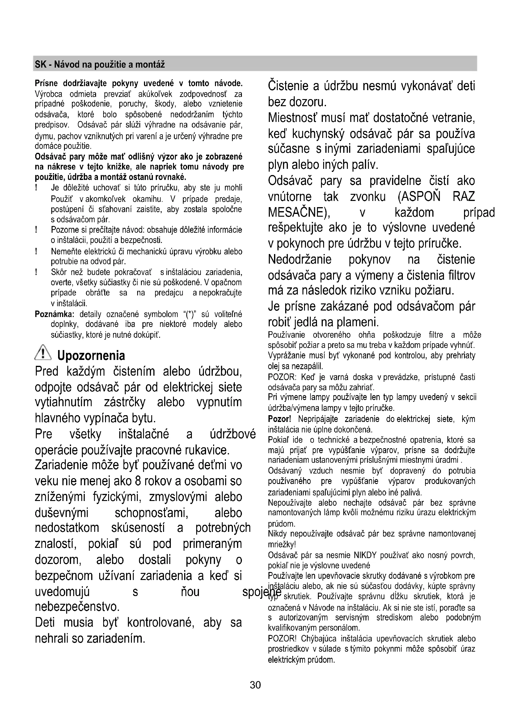 - K demontáži filtru postupujte opačně. NEUMYVATELNÝ filtr s aktivními uhlíky Saturace filtru s uhlíkem nastane po více či méně dlouhém užití, tj. závisí na typu kuchyně a pravidelném čištění filtru proti mastnotám. V každém případě je nutné nahradit patronu maximálně jednou za 4 měsíce. NEM ŮŽE být umýván či regenerován. Montáž Zavěste nejdříve filtr s aktivním uhlíkem vzadu, na kovový jazýček digestoře, pak vepředu, dvěma dvěma držadly. Demontáž Vyjměte filtr s aktivním uhlíkem tak, že budete otáčet o 90° držadla, která ho upevňují na digestoř. Výměna žárovek Digestoř je vybavena osvětlovacím systémem založeným na technologii DIOD. DIODY zaručují optimální osvětlení, s trvanlivostí až 10 krát delší než tradiční svídtila a umožňují úspory 90% elektrické energie. Pro výměny se obraťte na servisní službu.30 SK - Návod na použitie a montáž Prísne dodržiavajte pokyny uvedené v tomto návode. Výrobca odmieta prevziať akúkoľvek zodpovednosť za prípadné poškodenie, poruchy, škody, alebo vznietenie odsávača, ktoré bolo spôsobené nedodržaním týchto predpisov. Odsávač pár slúži výhradne na odsávanie pár, dymu, pachov vzniknutých pri varení a je určený výhradne pre domáce použitie. Odsávač pary môže mať odlišný výzor ako je zobrazené na nákrese v tejto knižke, ale napriek tomu návody pre použitie, údržba a montáž ostanú rovnaké. ! Je dôležité uchovať si túto príručku, aby ste ju mohli Použiť v akomkoľvek okamihu. V prípade predaje, postúpení či sťahovaní zaistite, aby zostala spoločne s odsávačom pár. ! Pozorne si prečítajte návod: obsahuje dôležité informácie o inštalácii, použití a bezpečnosti. ! Nemeňte elektrickú či mechanickú úpravu výrobku alebo potrubie na odvod pár. ! Skôr než budete pokračovať s inštaláciou zariadenia, overte, všetky súčiastky či nie sú poškodené. V opačnom prípade obráťte sa na predajcu a nepokračujte v inštalácii. Poznámka: detaily označené symbolom “(*)” sú voliteľné doplnky, dodávané iba pre niektoré modely alebo súčiastky, ktoré je nutné dokúpiť. Upozornenia Pred každým čistením alebo údržbou, odpojte odsávač pár od elektrickej siete vytiahnutím zástrčky alebo vypnutím hlavného vypínača bytu. Pre všetky inštalačné a údržbové operácie používajte pracovné rukavice. Zariadenie môže byť používané deťmi vo veku nie menej ako 8 rokov a osobami so zníženými fyzickými, zmyslovými alebo duševnými schopnosťami, alebo nedostatkom skúseností a potrebných znalostí, pokiaľ sú pod primeraným dozorom, alebo dostali pokyny o bezpečnom užívaní zariadenia a keď si uvedomujú s ňou spojené nebezpečenstvo. Deti musia byť kontrolované, aby sa nehrali so zariadením. Čistenie a údržbu nesmú vykonávať deti bez dozoru. Miestnosť musí mať dostatočné vetranie, keď kuchynský odsávač pár sa používa súčasne s inými zariadeniami spaľujúce plyn alebo iných palív. Odsávač pary sa pravidelne čistí ako vnútorne tak zvonku (ASPOŇ RAZ MESAČNE), v každom prípade rešpektujte ako je to výslovne uvedené v pokynoch pre údržbu v tejto príručke. Nedodržanie pokynov na čistenie odsávača pary a výmeny a čistenia filtrov má za následok riziko vzniku požiaru. Je prísne zakázané pod odsávačom pár robiť jedlá na plameni. Používanie otvoreného ohňa poškodzuje filtre a môže spôsobiť požiar a preto sa mu treba v každom prípade vyhnúť. Vyprážanie musí byť vykonané pod kontrolou, aby prehriaty olej sa nezapálil. POZOR: Keď je varná doska v prevádzke, prístupné časti odsávača pary sa môžu zahriať. Pri výmene lampy používajte len typ lampy uvedený v sekcii údržba/výmena lampy v tejto príručke. Pozor! Nepripájajte zariadenie do elektrickej siete, kým inštalácia nie úplne dokončená. Pokiaľ ide o technické a bezpečnostné opatrenia, ktoré sa majú prijať pre vypúšťanie výparov, prísne sa dodržujte nariadeniam ustanovenými príslušnými miestnymi úradmi . Odsávaný vzduch nesmie byť dopravený do potrubia používaného pre vypúšťanie výparov produkovaných zariadeniami spaľujúcimi plyn alebo iné palivá. Nepoužívajte alebo nechajte odsávač pár bez správne namontovaných lámp kvôli možnému riziku úrazu elektrickým prúdom. Nikdy nepoužívajte odsávač pár bez správne namontovanej mriežky! Odsávač pár sa nesmie NIKDY používať ako nosný povrch, pokiaľ nie je výslovne uvedené Používajte len upevňovacie skrutky dodávané s výrobkom pre inštaláciu alebo, ak nie sú súčasťou dodávky, kúpte správny typ skrutiek. Používajte správnu dĺžku skrutiek, ktorá je označená v Návode na inštaláciu. Ak si nie ste istí, poraďte sa s autorizovaným servisným strediskom alebo podobným kvalifikovaným personálom. POZOR! Chýbajúca inštalácia upevňovacích skrutiek alebo prostriedkov v súlade s týmito pokynmi môže spôsobiť úraz elektrickým prúdom.31 Tento spotrebič je označený v súlade s európskou smernicou 2012/19/EC o likvidácii elektrického a elektronického zariadenia (WEEE). Uistením sa, že tento výrobok bol po svojej životnosti odstránený správnym spôsobom, užívateľ prispieva k predchádzaniu možným negatívnym následkom pre životné prostredie a zdravie. Symbol výrobku alebo na jeho sprievodnej dokumentácii, upozorňuje, že s týmto výrobkom sa nesmie zaobchádzať ako s domácim odpadom, ale musí byť odovzdaný do príslušné miesta zberu pre recykláciu elektrických a elektronických prístrojov. Zbaviť sa ho riadením sa podľa miestnych zákonov o odstránení odpadkov. Kvôli dokonalejším informáciám o zaobchádzaní, znovuzískaní a recyklácii tohto výrobku, kontaktujte príslušné miestne úrady, služby pre zb