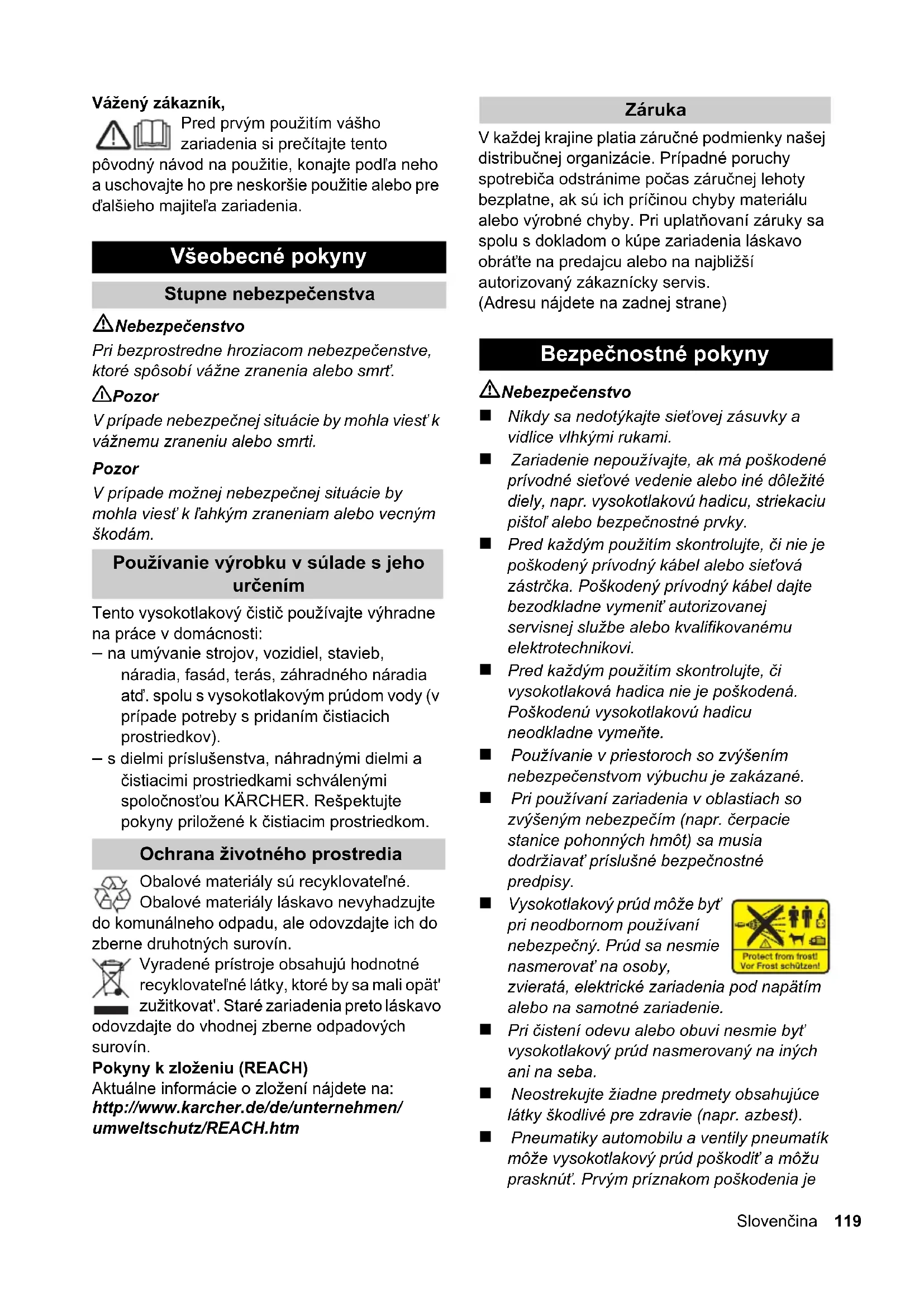 (2000/14/EG) dB(A) 85 86 Declaraţie CE Produs: Aparat de curăţare sub presiune Tip: 1.636-xxx Directive EG respectate: 98/37/CE (până 28.12.2009) 2006/42/CE (de la 29.12.2009) 2004/108/CE 2000/14/CE Norme armonizate utilizate: EN 55014–1: 2006 EN 55014–2: 1997 + A1: 2001 EN 60335–1 EN 60335–2–79 EN 61000–3–2: 2006 EN 61000–3–3: 2008 EN 62233: 2008 Procedura de evaluare a conformităţii: Anexa V Nivel de zgomot dB(A) K 3.91 M măsurat: 84 garantat: 85 K 4.91 M măsurat: 84 garantat: 86 CEO Head of Approbation 118 RomâneşteDeutsch 3 Vážený zákazník, Pred prvým použitím vášho zariadenia si prečítajte tento pôvodný návod na použitie, konajte podľa neho a uschovajte ho pre neskoršie použitie alebo pre ďalšieho majiteľa zariadenia. Nebezpečenstvo Pri bezprostredne hroziacom nebezpečenstve, ktoré spôsobí vážne zranenia alebo smrť. 몇 Pozor V prípade nebezpečnej situácie by mohla viesť k vážnemu zraneniu alebo smrti. Pozor V prípade možnej nebezpečnej situácie by mohla viesť k ľahkým zraneniam alebo vecným škodám. Tento vysokotlakový čistič používajte výhradne na práce v domácnosti: – na umývanie strojov, vozidiel, stavieb, náradia, fasád, terás, záhradného náradia atď. spolu s vysokotlakovým prúdom vody (v prípade potreby s pridaním čistiacich prostriedkov). – s dielmi príslušenstva, náhradnými dielmi a čistiacimi prostriedkami schválenými spoločnosťou KÄRCHER. Rešpektujte pokyny priložené k čistiacim prostriedkom. Obalové materiály sú recyklovateľné. Obalové materiály láskavo nevyhadzujte do komunálneho odpadu, ale odovzdajte ich do zberne druhotných surovín. Vyradené prístroje obsahujú hodnotné recyklovateľné látky, ktoré by sa mali opät' zužitkovat'. Staré zariadenia preto láskavo odovzdajte do vhodnej zberne odpadových surovín. Pokyny k zloženiu (REACH) Aktuálne informácie o zložení nájdete na: http://www.karcher.de/de/unternehmen/ umweltschutz/REACH.htm V každej krajine platia záručné podmienky našej distribučnej organizácie. Prípadné poruchy spotrebiča odstránime počas záručnej lehoty bezplatne, ak sú ich príčinou chyby materiálu alebo výrobné chyby. Pri uplatňovaní záruky sa spolu s dokladom o kúpe zariadenia láskavo obráťte na predajcu alebo na najbližší autorizovaný zákaznícky servis. (Adresu nájdete na zadnej strane) Nebezpečenstvo Nikdy sa nedotýkajte sieťovej zásuvky a vidlice vlhkými rukami. Zariadenie nepoužívajte, ak má poškodené prívodné sieťové vedenie alebo iné dôležité diely, napr. vysokotlakovú hadicu, striekaciu pištoľ alebo bezpečnostné prvky. Pred každým použitím skontrolujte, či nie je poškodený prívodný kábel alebo sieťová zástrčka. Poškodený prívodný kábel dajte bezodkladne vymeniť autorizovanej servisnej službe alebo kvalifikovanému elektrotechnikovi. Pred každým použitím skontrolujte, či vysokotlaková hadica nie je poškodená. Poškodenú vysokotlakovú hadicu neodkladne vymeňte. Používanie v priestoroch so zvýšením nebezpečenstvom výbuchu je zakázané. Pri používaní zariadenia v oblastiach so zvýšeným nebezpečím (napr. čerpacie stanice pohonných hmôt) sa musia dodržiavať príslušné bezpečnostné predpisy. Vysokotlakový prúd môže byť pri neodbornom používaní nebezpečný. Prúd sa nesmie nasmerovať na osoby, zvieratá, elektrické zariadenia pod napätím alebo na samotné zariadenie. Pri čistení odevu alebo obuvi nesmie byť vysokotlakový prúd nasmerovaný na iných ani na seba. Neostrekujte žiadne predmety obsahujúce látky škodlivé pre zdravie (napr. azbest). Pneumatiky automobilu a ventily pneumatík môže vysokotlakový prúd poškodiť a môžu prasknúť. Prvým príznakom poškodenia je Všeobecné pokyny Stupne nebezpečenstva Používanie výrobku v súlade s jeho určením Ochrana životného prostredia Záruka Bezpečnostné pokyny Slovenčina 1194 Deutsch zmena sfarbenia pneumatiky. Poškodené pneumatiky automobilu a ventily sú životne nebezpečné. Pri čistení prúdom vody dodržiavajte odstup najmenej 30 cm! Nikdy nevysávajte kvapaliny s obsahom rozpúšťadla alebo neriedené kyseliny a rozpúšťadlá! Do tejto skupiny patrí napr. benzín, riedidlo na farby alebo vykurovací olej. Rozprašovaná hmla je vysoko horľavá, výbušná a jedovatá. Je zakázané použitie acetónu, neriedených kyselín a rozpúšťadiel, pretože napadajú materiály použité v zariadení. 몇 Pozor Sieťová zástrčka a spojka predlžovacieho kábla musia byť vodotesné a nesmú ležať vo vode. Nevhodné predlžovacie vedenia môžu byť nebezpečné. Vo vonkajšom prostredí používajte výhradne schválené a patrične označené predlžovacie káble s dostatočným prierezom vodiča: 1 - 10 m: 1,5 mm