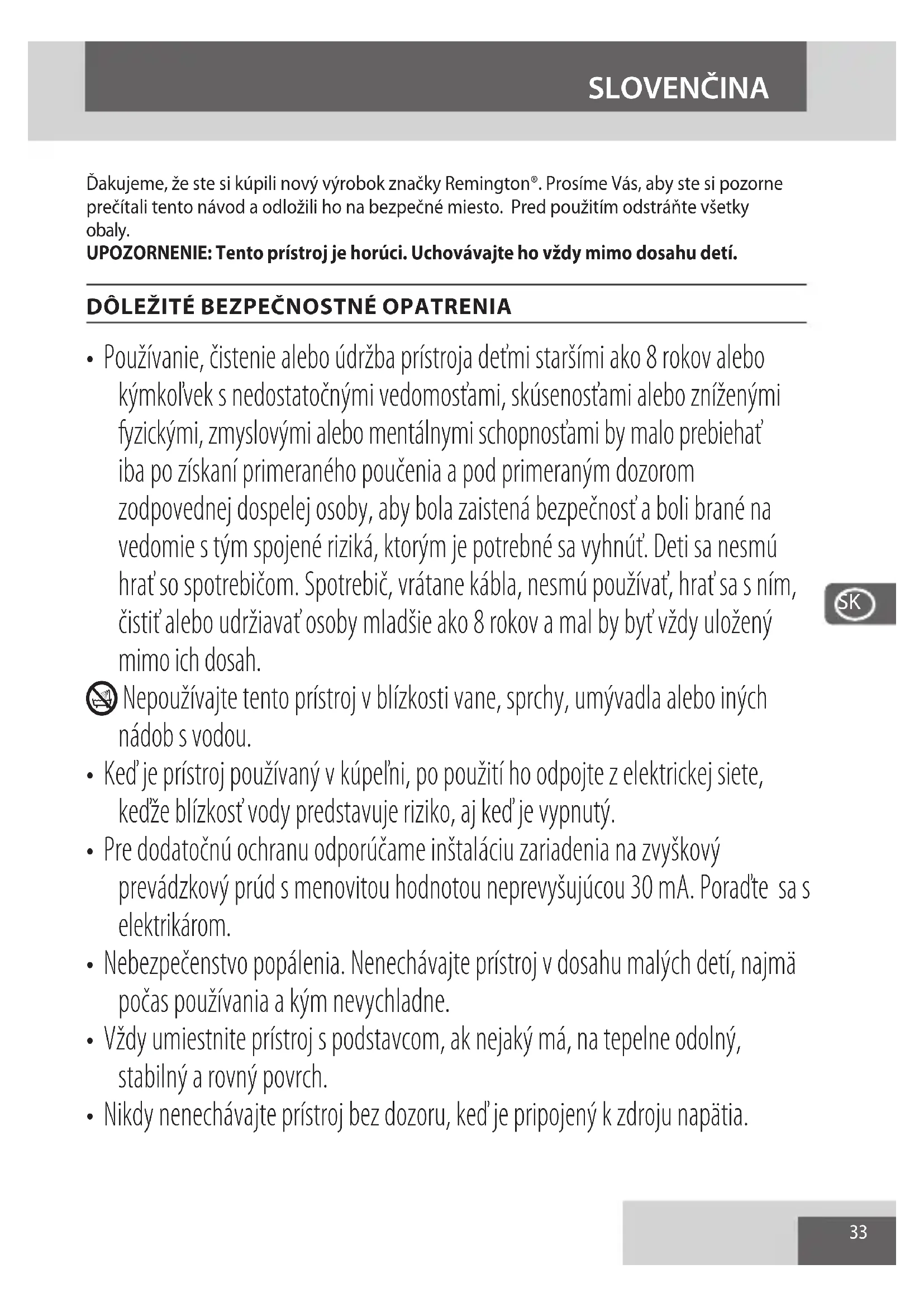 - Ak sa elektrický kábel tohto prístroja poškodí, prestaňte okamžite s jeho používaním a prístroj odovzdajte do najbližšieho servisného strediska Remington® na opravu alebo výmenu, aby ste predišli akémukoľvek riziku.
