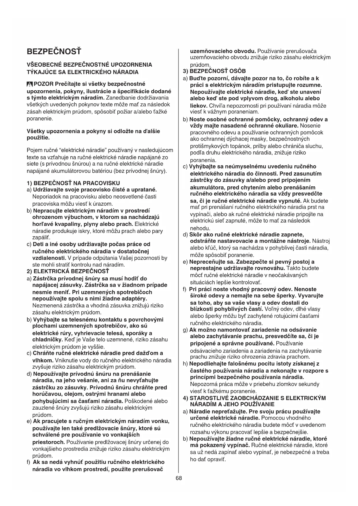 TÝKAJÚCE SA ELEKTRICKÉHO NÁRADIA POZOR Prečítajte si všetky bezpečnostné upozornenia, pokyny, ilustrácie a špecifikácie dodané s týmto elektrickým náradím. Zanedbanie dodržiavania všetkých uvedených pokynov texte môže mať za následok zásah elektrickým prúdom, spôsobiť požiar a/alebo ťažké poranenie. Všetky upozornenia a pokyny si odložte na ďalšie použitie. Pojem ručné “elektrické náradie” používaný v nasledujúcom texte sa vzťahuje na ručné elektrické náradie napájané zo siete (s prívodnou šnúrou) a na ručné elektrické náradie napájané akumulátorovou batériou (bez prívodnej šnúry).