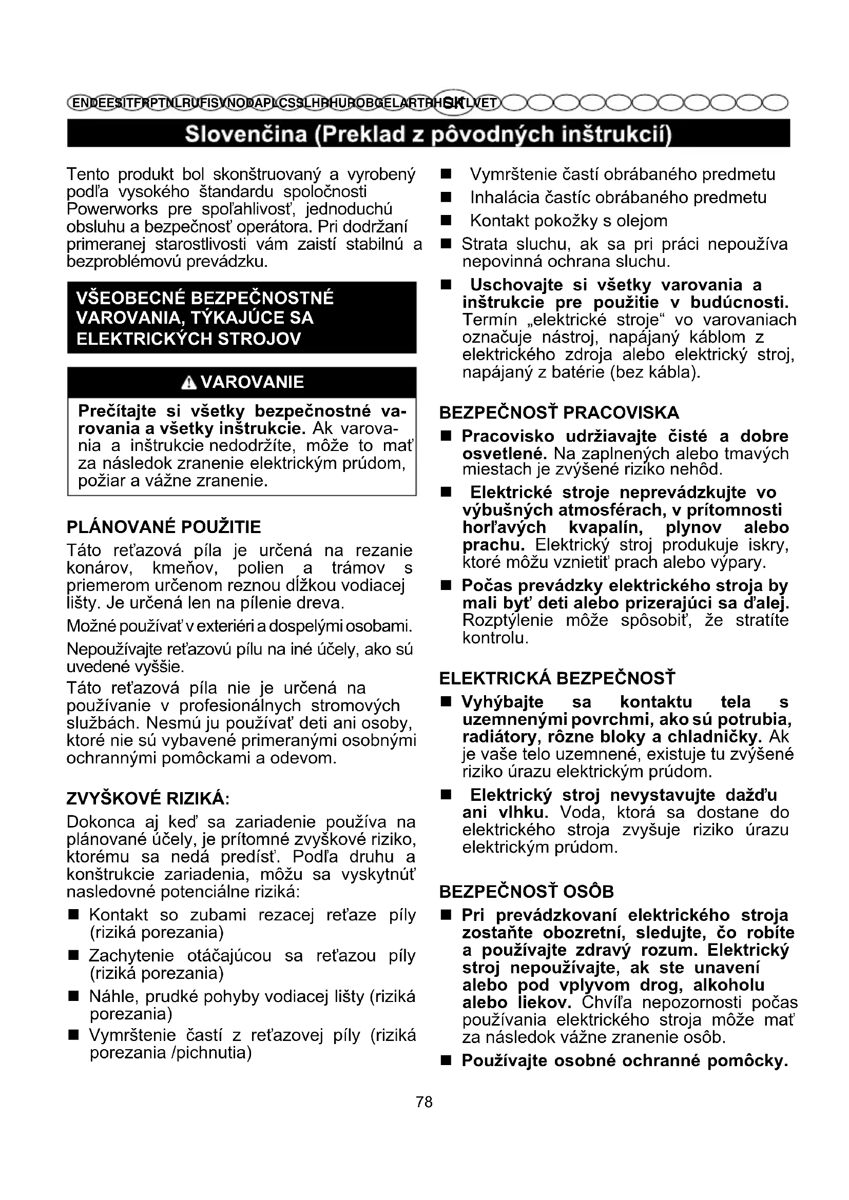 Táto reťazová píla je určená na rezanie konárov, kmeňov, polien a trámov s priemerom určenom reznou dĺžkou vodiacej lišty. Je určená len na pílenie dreva. Možné používať v exteriéri a dospelými osobami. Nepoužívajte reťazovú pílu na iné účely, ako sú uvedené vyššie. Táto reťazová píla nie je určená na používanie v profesionálnych stromových službách. Nesmú ju používať deti ani osoby, ktoré nie sú vybavené primeranými osobnými ochrannými pomôckami a odevom. ZVYŠKOVÉ RIZIKÁ: Dokonca aj keď sa zariadenie používa na plánované účely, je prítomné zvyškové riziko, ktorému sa nedá predísť. Podľa druhu a konštrukcie zariadenia, môžu sa vyskytnúť nasledovné potenciálne riziká: Kontakt so zubami rezacej reťaze píly (riziká porezania) Zachytenie otáčajúcou sa reťazou píly (riziká porezania) Náhle, prudké pohyby vodiacej lišty (riziká porezania) Vymrštenie častí z reťazovej píly (riziká porezania /pichnutia) Vymrštenie častí obrábaného predmetu Inhalácia častíc obrábaného predmetu Kontakt pokožky s olejom Strata sluchu, ak sa pri práci nepoužíva nepovinná ochrana sluchu. Uschovajte si všetky varovania a inštrukcie pre použitie v budúcnosti. Termín „elektrické stroje“ vo varovaniach označuje nástroj, napájaný káblom z elektrického zdroja alebo elektrický stroj, napájaný z batérie (bez kábla).