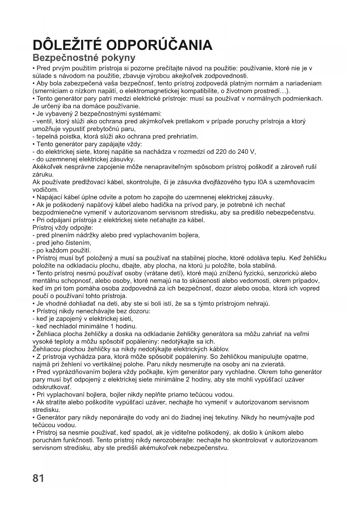 - Tento generátor pary patrí medzi elektrické prístroje: musí sa používať v normálnych podmienkach. Je určený iba na domáce používanie.
