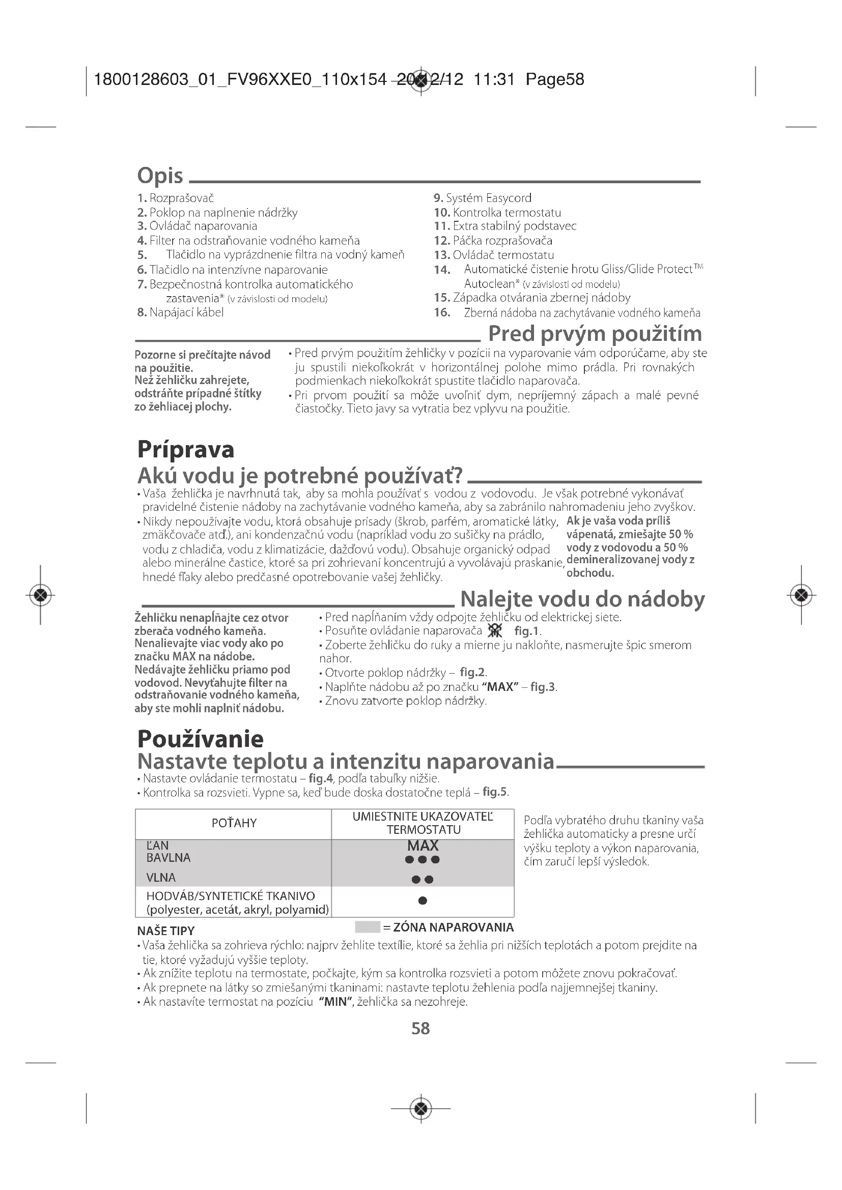 - Omotajte kábel okolo zadného oblúka žehličky. Položte žehličku na podstavec – fig.24. Upozornenie! Použitie drsného tampónu poškodzuje automaticky čistiaci povrch (v závislosti od modelu) vášho hrotu – fig.22. Upozornenie – Nikdy sa nedotýkajte predĺženej časti filtra – fig. 18. – Žehlička bez filtra na odstraňovanie vodného kameňa nefunguje. Upozornenie Žehlička bez zbernej nádoby na vodný kameň nefunguje. Nikdy nepoužívajte agresívne alebo drsné čistiace látky. 1800128603_01_FV96XXE0_110x154 20/12/12 11:31 Page60PROBLÉM MOŽNÉ PRÍČINY RIEŠENIA Voda vyteká cez otvor hrotu. Používate naparovanie, ale žehlička ešte nie je dostatočne teplá. Počkajte, kým sa kontrolka rozsvieti. Používate tlačidlo naparovania príliš často. Počkajte niekoľko sekúnd medzi každým použitím. Položili ste žehličku na plochú stranu bez toho, aby ste ju vyprázdnili a bez toho, aby ste posunuli ovládač do polohy . Prečítajte si kapitolu «Odkladanie žehličky». Filter na odstraňovanie vodného kameňa nie je správne umiestnený. Založe filter na odstraňovanie vodného kameňa správne: zatlačte, až kým nezaklapne. Dajte vodu do zbernej nádoby na vodný kameň. Nikdy nedávajte vodu do zbernej nádoby na vodný kameň. Hnedé fľaky vychádzajú z hrotu a zachytávajú sa na prádle. Používate chemické prípravky proti vodnému kameňu. Nikdy nepridávajte do nádoby s vodou prípravky na odstraňovanie vodného kameňa. Nepoužívate správny typ vody. Spustite automatické čistenie a prečítajte si kapitolu «Akú vodu je potrebné používať?». Vlákna prádla sa nahromadili v otvore hrotu a zachytil sa na nich vodný kameň. Spustite automatické čistenie. Vyčistite hrot nekovovou špongiou. Priebežne vysávajte otvor hrotu. Hrot je špinavý alebo zahnednutý a môže znečistiť prádlo. Používate príliš vysokú teplotu. Očistite hrot podľa opisu vyššie. Pozrite si tabuľku s teplotami a nastavte termostat. Vaše prádlo nie je dostatočne vyžehlené alebo ste použili škrob. Nastriekajte škrob na zadnú stranu žehlenej látky. Vaša žehlička nenaparuje alebo naparuje iba veľmi málo. Nádoba je prázdna. Nalejte vodu do nádoby. Filter na odstraňovanie vodného kameňa je znečistený. Očistite filter na odstraňovanie vodného kameňa. Na vašej žehličke sú usadeniny. Očistite filter na odstraňovanie vodného kameňa a spustite automatické čistenie. Vaša žehlička sa používa príliš dlho nasucho. Spustite automatické čistenie. Hrot je poškriabaný alebo opotrebovaný. Žehličku ste položili na podložku s kovovým povrchom. Žehličku ste čistili drsnou alebo kovovou špongiou. Vždy položte žehličku na podstavec. Prečítajte si kapitolu «Čistenie hrotu». Z hrotu sa uvoľňujú čiastočky. Na hrote sa začína tvoriť vodný kameň. Vykonajte čistenie a údržbu uvedené v tomto pokyne. Cez poklop nádržky vyteká voda. Poklop nádržky ste nezatvorili dobre. Skontrolujte, či je poklop nádržky dobre zatvorený. Po naplnení nádrže žehlička uvoľňuje paru. Ovládač pary nie je umiestnený v pozícii . Skontrolujte, či je ovládač umiestnený v pozícii . Z rozprašovača nestrieka voda. Nádoba je prázdna. Do nádoby nalejte vodu. Voda vyteká zo zadnej časti žehličky. Nádoba nie je správne založená na svojom mieste. Založte znovu nádobu do správnej polohy.