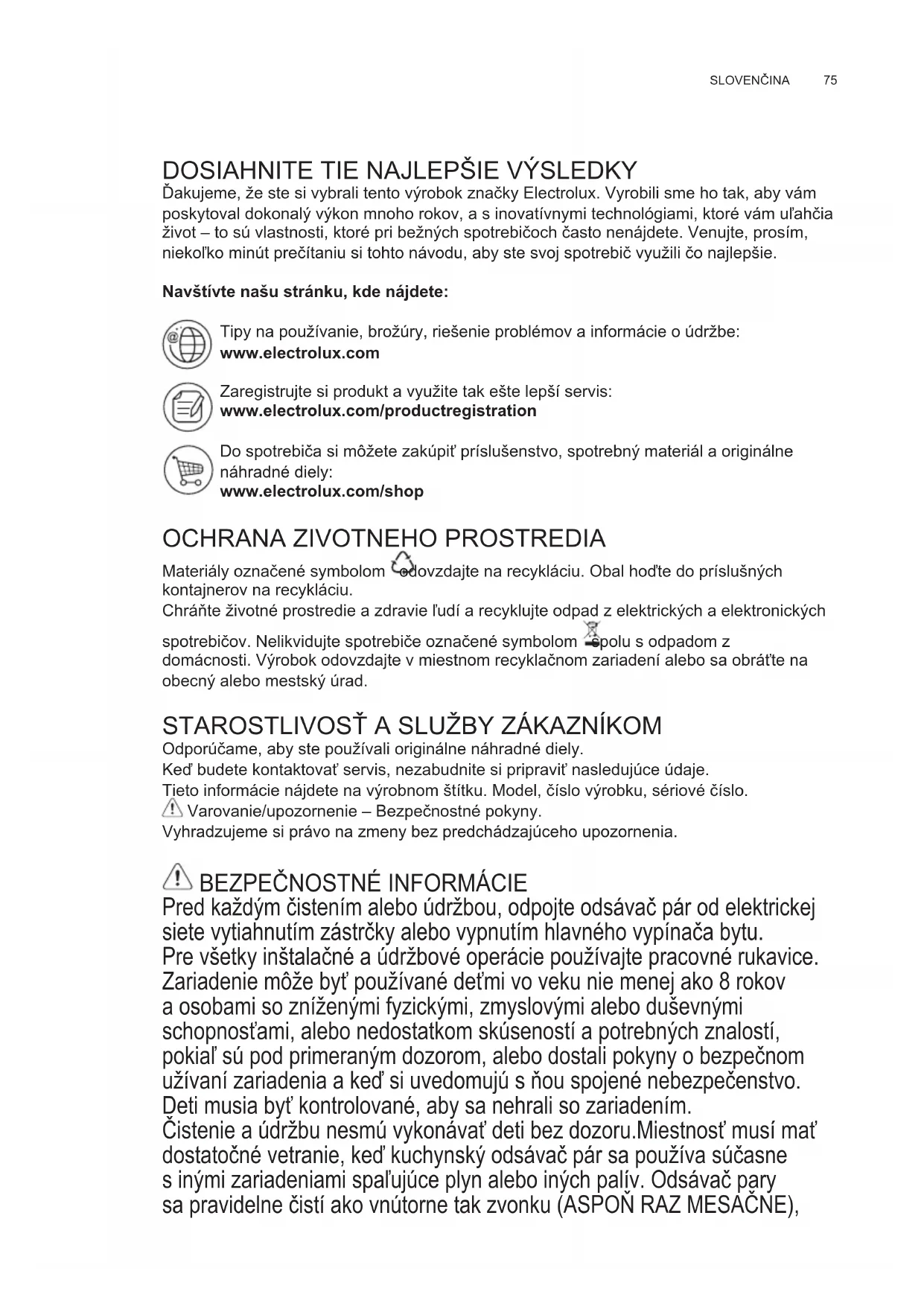 Ďakujeme, že ste si vybrali tento výrobok značky Electrolux. Vyrobili sme ho tak, aby vám poskytoval dokonalý výkon mnoho rokov, a s inovatívnymi technológiami, ktoré vám uľahčia život – to sú vlastnosti, ktoré pri bežných spotrebičoch často nenájdete. Venujte, prosím, niekoľko minút prečítaniu si tohto návodu, aby ste svoj spotrebič využili čo najlepšie. Navštívte našu stránku, kde nájdete: Tipy na používanie, brožúry, riešenie problémov a informácie o údržbe: www.electrolux.com Zaregistrujte si produkt a využite tak ešte lepší servis: www.electrolux.com/productregistration Do spotrebiča si môžete zakúpiť príslušenstvo, spotrebný materiál a originálne náhradné diely: www.electrolux.com/shop