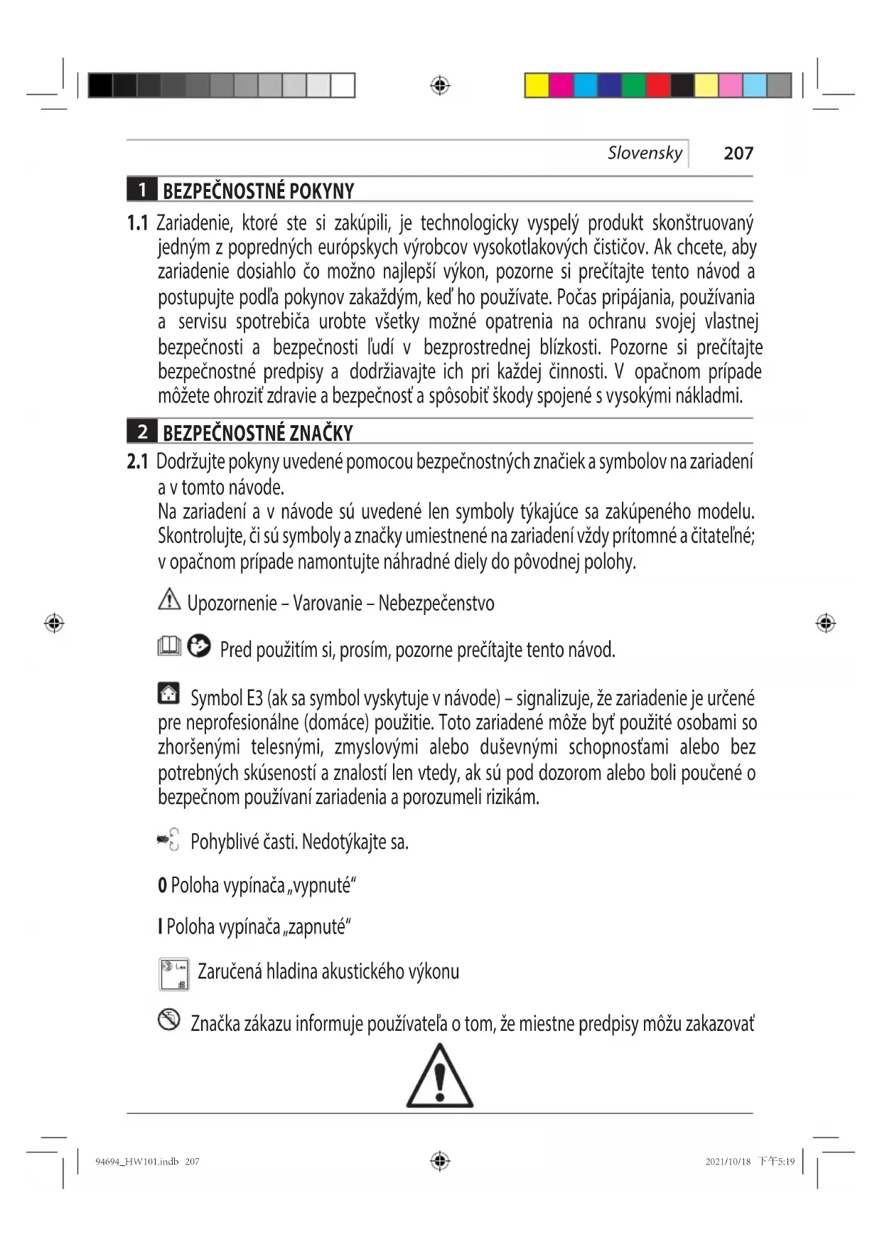 a v tomto návode. Na zariadení a v návode sú uvedené len symboly týkajúce sa zakúpeného modelu. Skontrolujte, či sú symboly a značky umiestnené na zariadení vždy prítomné a čitateľné; v opačnom prípade namontujte náhradné diely do pôvodnej polohy. Upozornenie – Varovanie – Nebezpečenstvo Pred použitím si, prosím, pozorne prečítajte tento návod. Symbol E3 (ak sa symbol vyskytuje v návode) – signalizuje, že zariadenie je určené pre neprofesionálne (domáce) použitie. Toto zariadené môže byť použité osobami so zhoršenými telesnými, zmyslovými alebo duševnými schopnosťami alebo bez potrebných skúseností a znalostí len vtedy, ak sú pod dozorom alebo boli poučené o bezpečnom používaní zariadenia a porozumeli rizikám. Pohyblivé časti. Nedotýkajte sa. 0 Poloha vypínača „vypnuté“ I Poloha vypínača „zapnuté“ Zaručená hladina akustického výkonu Značka zákazu informuje používateľa o tom, že miestne predpisy môžu zakazovať 94694_HW101.indb 20794694_HW101.indb 207 2021/10/18 下午5:192021/10/18 下午5:19208 Slovensky pripojenie výrobku do systému zásobovania pitnou vodou. Značka nebezpečenstva varuje používateľa, aby nemieril prúdom vody na osoby, zvieratá, elektrické zariadenia alebo samotný výrobok. Tento produkt je zaradený do triedy izolácie II. To znamená, že má zosilnenú alebo dvojitú izoláciu (iba ak je symbol uvedený na zariadení). Tento produkt je v súlade s príslušnými európskymi smernicami. Symbol E1 – znamená, že zariadenie nesmie byť likvidované ako komunálny odpad; môže byť odovzdané predajcovi pri kúpe nového zariadenia. Elektrické a elektronické diely zariadenia sa nesmú opätovne používať na nesprávne účely, pretože obsahujú látky, ktoré sú zdraviu nebezpečné. Len pre štáty EÚ Z dôvodu prítomnosti nebezpečných komponentov v zariadení môžu mať použité elektrické a elektronické zariadenia negatívny vplyv na životné prostredie a ľudské zdravie. Elektrické a elektronické zariadenia nelikvidujte spolu s komunálnym odpadom! V súlade s európskou smernicou o odpade z elektrických a elektronických zariadení a v súlade s prispôsobenými vnútroštátnymi právnymi predpismi by sa použité elektrické a elektronické zariadenia mali zbierať osobitne a odovzdávať na samostatnom zbernom mieste pre komunálny odpad, ktoré sa prevádzkuje v súlade s predpismi na ochranu životného prostredia. Označuje to symbol preškrtnutej smetnej nádoby na zariadení. Používajte chrániče sluchu. Používajte ochrannú masku. Používajte ochranu dýchacích ciest. Používajte ochranné rukavice. Používajte bezpečnostnú obuv. Používajte ochranný odev. 94694_HW101.indb 20894694_HW101.indb 208 2021/10/18 下午5:192021/10/18 下午5:19209 Slovensky