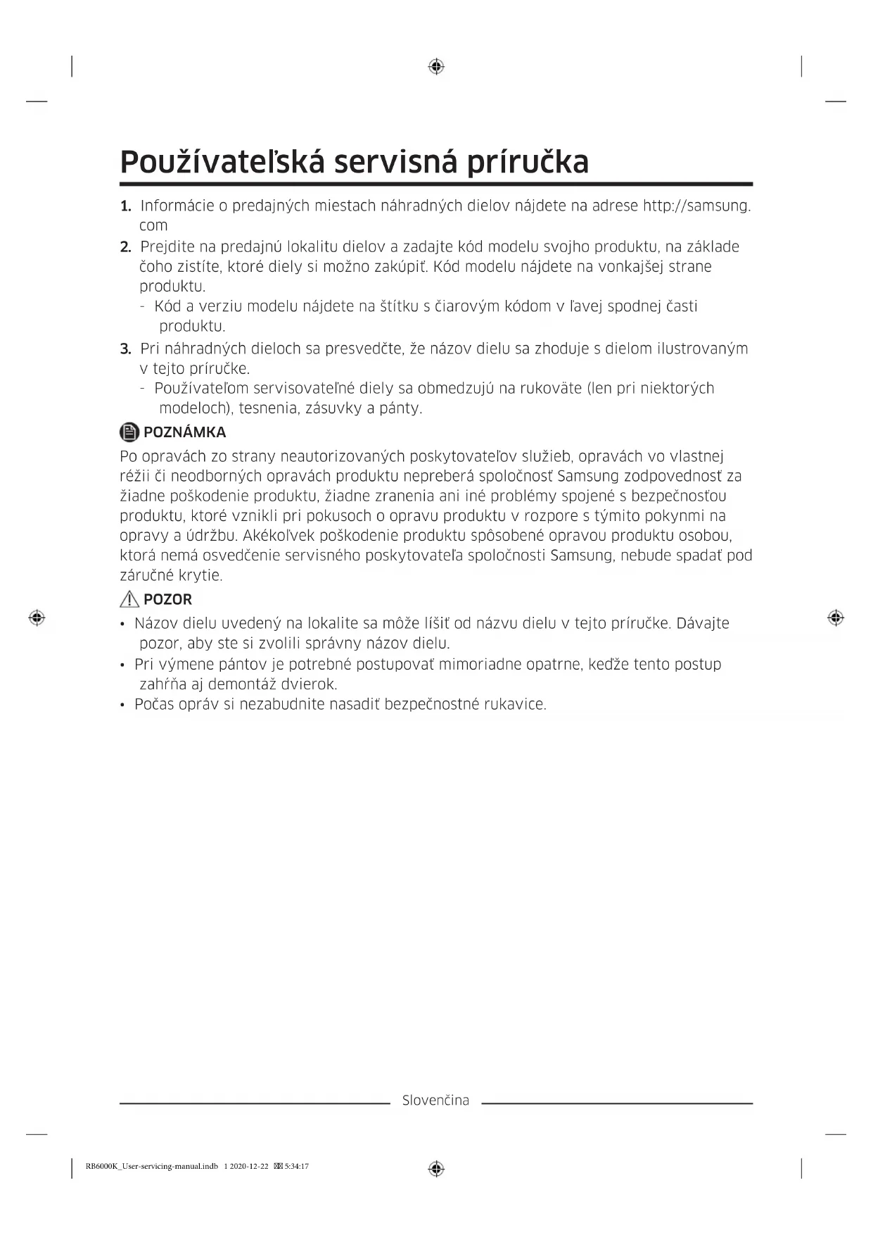 - Počas opráv si nezabudnite nasadiť bezpečnostné rukavice. RB6000K_User-servicing-manual.indb 1 2020-12-22 5:34:17Slovenčina Skutočný vzhľad a uvedené diely chladničky sa môžu líšiť v závislosti od modelu a krajiny.