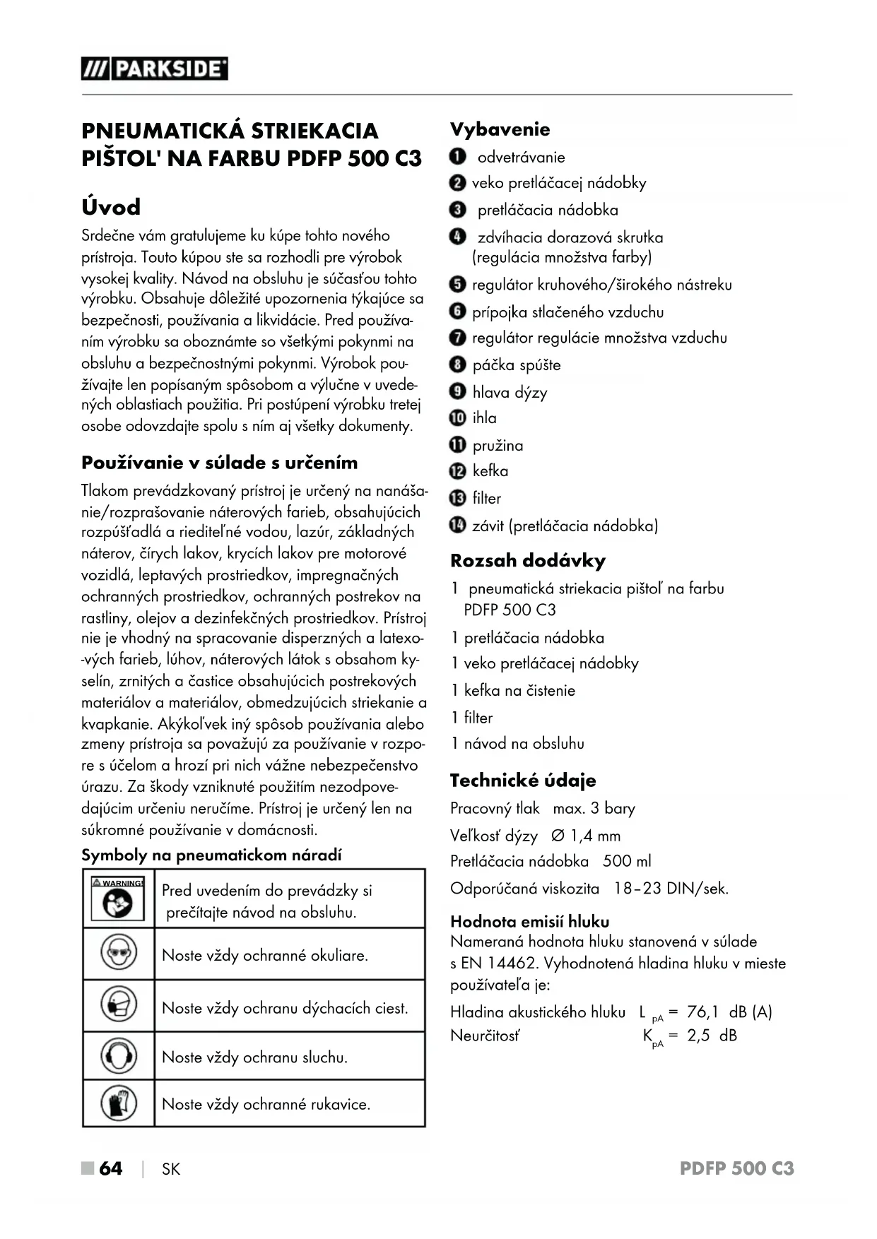 žívajte len popísaným spôsobom a výlučne vuvede- ných oblastiach použitia. Pri postúpení výrobku tretej osobe odovzdajte spolu sním aj všetky dokumenty. Používanie vsúlade surčením Tlakom prevádzkovaný prístroj je určený na nanáša- nie/rozprašovanie náterových farieb, obsahujúcich rozpúšťadlá a riediteľné vodou, lazúr, základných náterov, čírych lakov, krycích lakov pre motorové vozidlá, leptavých prostriedkov, impregnačných ochranných prostriedkov, ochranných postrekov na rastliny, olejov a dezinfekčných prostriedkov. Prístroj nie je vhodný na spracovanie disperzných a latexo- -vých farieb, lúhov, náterových látok s obsahom ky- selín, zrnitých a častice obsahujúcich postrekových materiálov a materiálov, obmedzujúcich striekanie a kvapkanie. Akýkoľvek iný spôsob používania alebo zmeny prístroja sa považujú za používanie v rozpo- re súčelom a hrozí pri nich vážne nebezpečenstvo úrazu. Za škody vzniknuté použitím nezodpove- dajúcim určeniu neručíme. Prístroj je určený len na súkromné používanie v domácnosti. Symboly na pneumatickom náradí WARNING! Pred uvedením do prevádzky si prečítajte návod na obsluhu. Noste vždy ochranné okuliare. Noste vždy ochranu dýchacích ciest. Noste vždy ochranu sluchu. Noste vždy ochranné rukavice. Vybavenie odvetrávanie veko pretláčacej nádobky pretláčacia nádobka zdvíhacia dorazová skrutka (regulácia množstva farby) regulátor kruhového/širokého nástreku prípojka stlačeného vzduchu regulátor regulácie množstva vzduchu páčka spúšte hlava dýzy ihla pružina kefka filter závit (pretláčacia nádobka) Rozsah dodávky 1 pneumatická striekacia pištoľ na farbu PDFP 500 C3 1 pretláčacia nádobka 1 veko pretláčacej nádobky 1 kefka na čistenie 1 filter 1 návod na obsluhu Technické údaje Pracovný tlak max. 3 bary Veľkosť dýzy Ø 1,4 mm Pretláčacia nádobka 500 ml Odporúčaná viskozita 18–23 DIN/sek. Hodnota emisií hluku Nameraná hodnota hluku stanovená vsúlade sEN14462. Vyhodnotená hladina hluku v mieste používateľa je: Hladina akustického hluku L